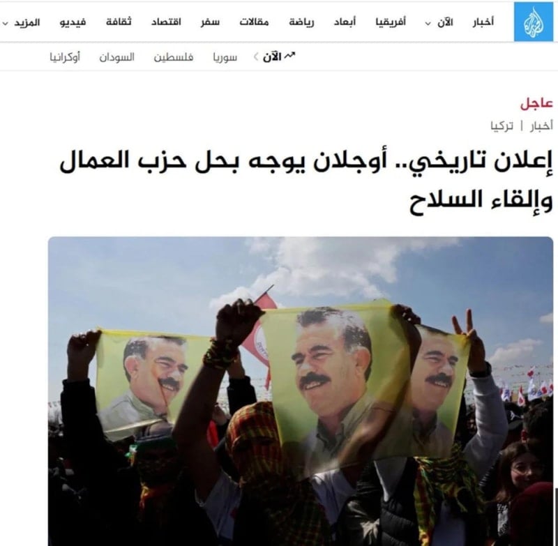 Katar merkezli El Cezire, haberine "Tarihi duyuru. Öcalan, PKK'nın kapatılması ve silahların bırakılması talimatını verdi" başlığını attı.