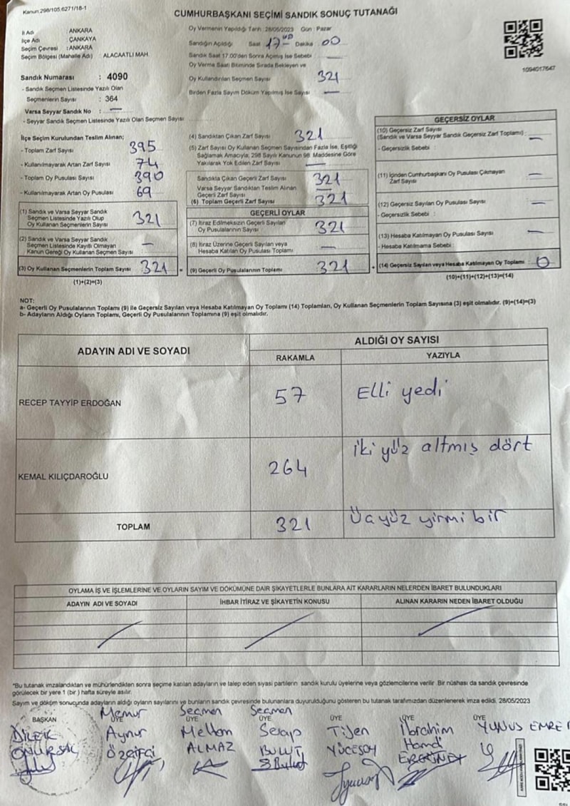 28 Mayıs'ta 321 seçmenin oy kullandığı sandıktan, 57 oy Recep Tayyip Erdoğan'a, 264 oy ise Kemal Kılıçdaroğlu'na çıktığı tutanaklara yansıdı.