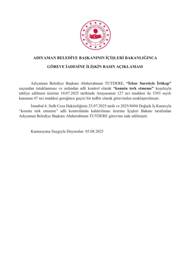 İstanbul 6. Sulh Ceza Hakimliği'nin kararıyla 'konutu terk etmeme' adli kontrolünün kaldırılması üzerine İçişleri Bakanı tarafından Adıyaman Belediye Başkanı Abdurrahman Tutdere görevine iade edilmiştir."