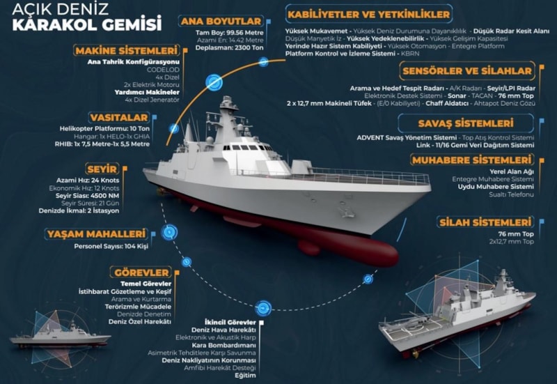 Uzun Menzilli Etkin Silah Sistemleri: Yerli satıhtan satha güdümlü mermi (yerinde hazır), yerli satıhtan havaya güdümlü mermi, yerli 76 mm top ve 12.7 mm silahlar