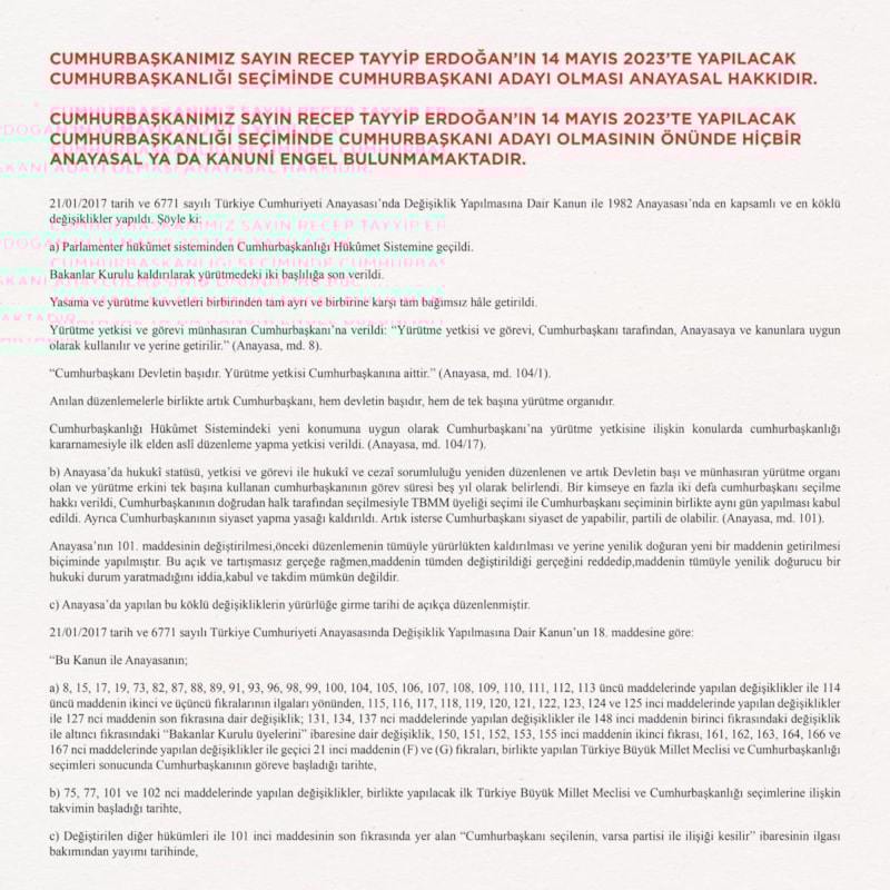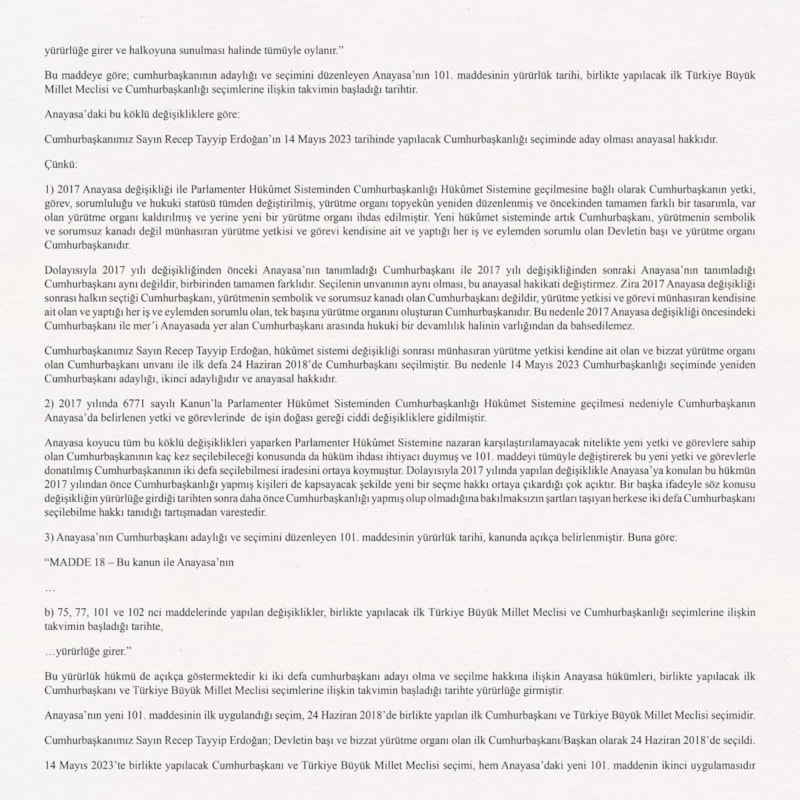 Gerek Anayasa hukukunun temel ilkeleri, gerek yorum yöntemleri, gerek yasama belgeleri gerek ise Anayasa Mahkemesi içtihadı uyarınca Cumhurbaşkanımız Sayın Recep Tayyip Erdoğan'ın 14 Mayıs 2023'te yapılacak cumhurbaşkanlığı seçimlerinde cumhurbaşkanı adayı olması ve cumhurbaşkanı seçilmesinin önünde hiçbir anayasal ya da yasal engel yoktur. Siyasi hesaplarla ya da Anayasaya aykırı yorumlarla Anayasa hükümleri değişmez ve değiştirilemez. Cumhurbaşkanımız Sayın Recep Tayyip Erdoğan'ın 14 Mayıs 2023'te yapılacak Cumhurbaşkanlığı seçimindeki cumhurbaşkanı adaylığı, Anayasa'nın yeni 101'inci maddesine göre ikinci adaylığıdır. Cumhurbaşkanımız Sayın Recep Tayyip Erdoğan'ın 14 Mayıs 2023 seçimlerinde cumhurbaşkanı adayı olması anayasal hakkıdır. Bu hakkını kullanmasının önünde de hiçbir anayasal ya da kanuni engel yoktur. Ayrıca bu hakkın kullanımı da Anayasa'nın teminatı altındadır.