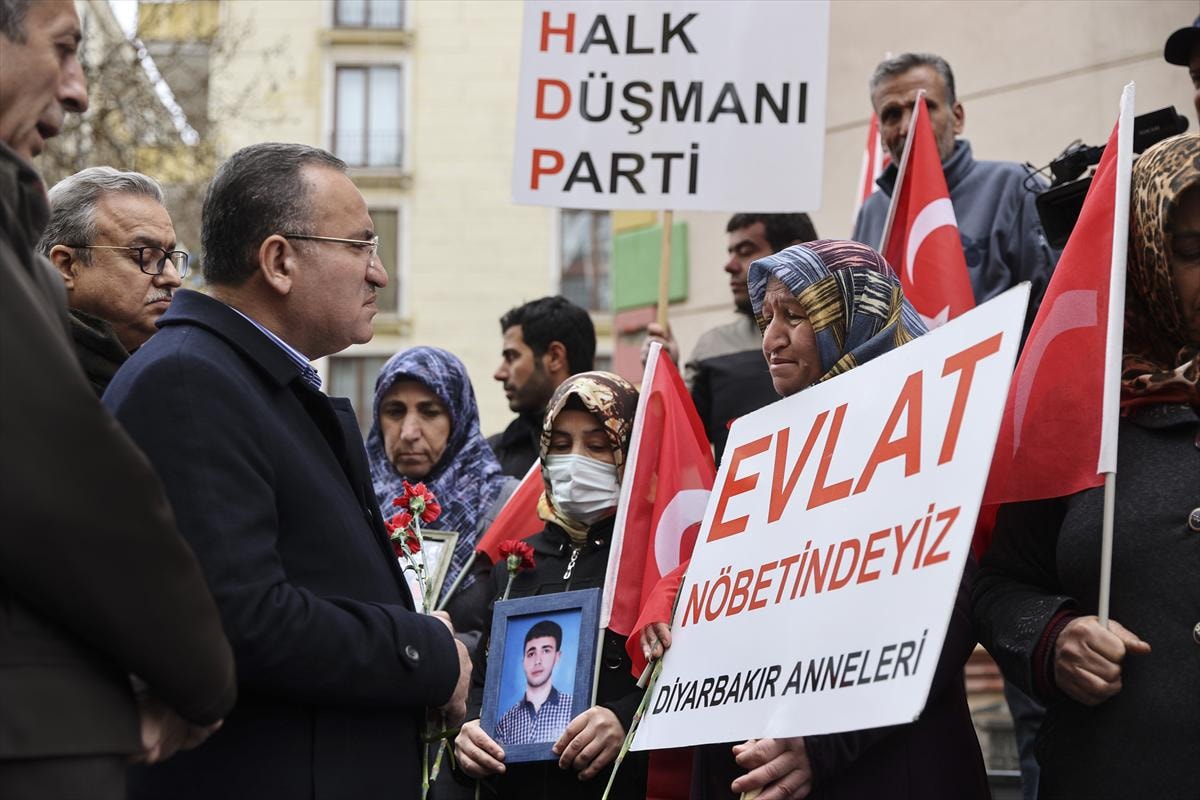 Adalet Bakanı Bekir Bozdağ, evlatlarının yolunu gözleyen aileleri ziyaret etti. Annelerle sohbet eden Bozdağ, karanfil dağıttı.
