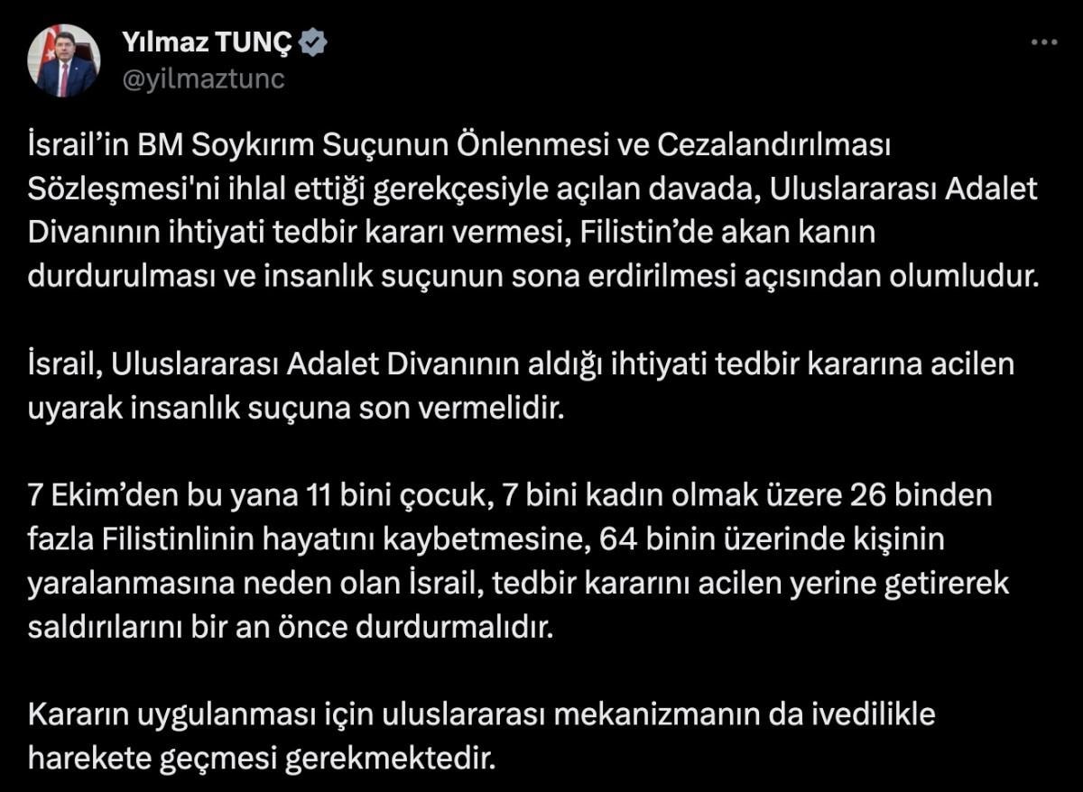 Bakan Tunç, Uluslararası Adalet Divanı'nın ihtiyati tedbir kararı vermesini, Filistin’de akan kanın durdurulması ve insanlık suçunun sona erdirilmesi açısından olumlu olduğunu belirtti.
