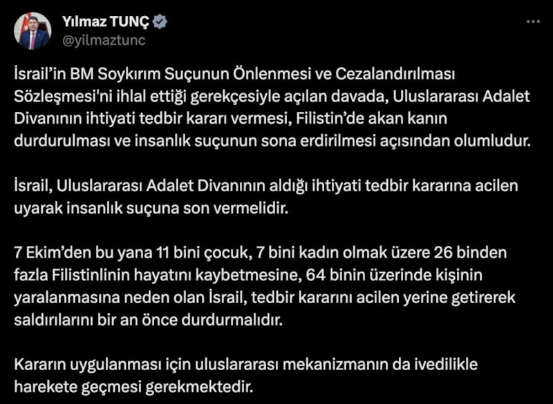 Sosyal medya hesabı üzerinden açıklama yapan Adalet Bakanı Tunç, "İsrail Uluslararası Adalet Divanı'nın aldığı ihtiyati tedbir kararına acilen uyarak insanlık suçuna son vermelidir" dedi.