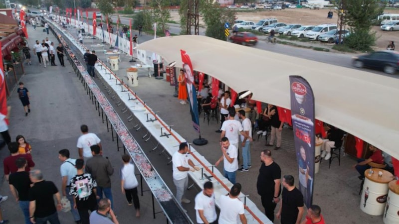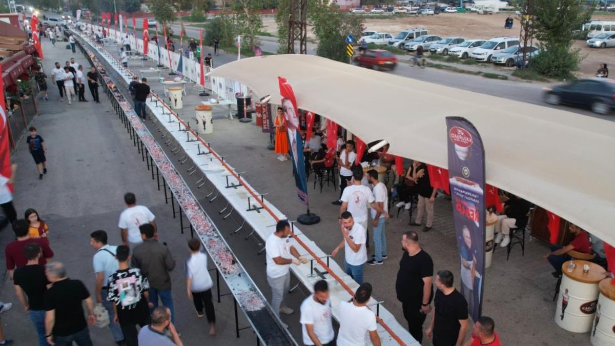 Yaklaşık 20 dakikada pişen 100 metrelik boru kebabı daha sonra 500 kişiye dağıtıldı. Ayrıca 100 metrelik kebap nedeniyle gökyüzü adeta dumanla kaplandı ve o anlar dron ile görüntülendi.