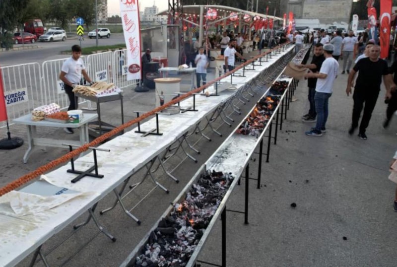 Adanalı kebapçı, Cumhuriyetin 100. yılı nedeniyle tek şişte 100 metrelik boru kebabı yaptı. Hazırlanan kebap vatandaşlara ikram edilirken dumanı gökyüzünü kapladı.