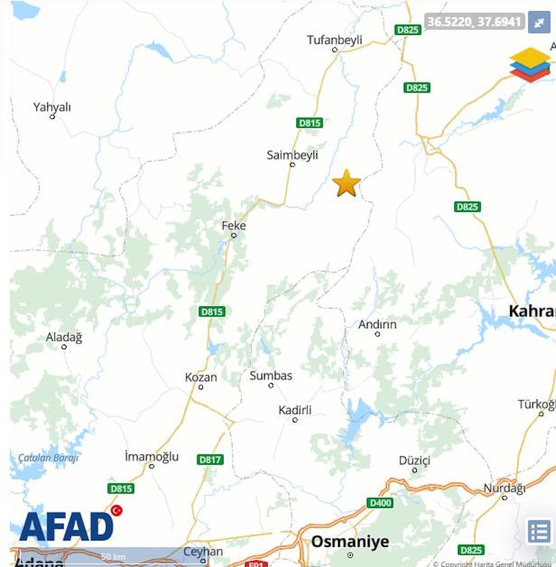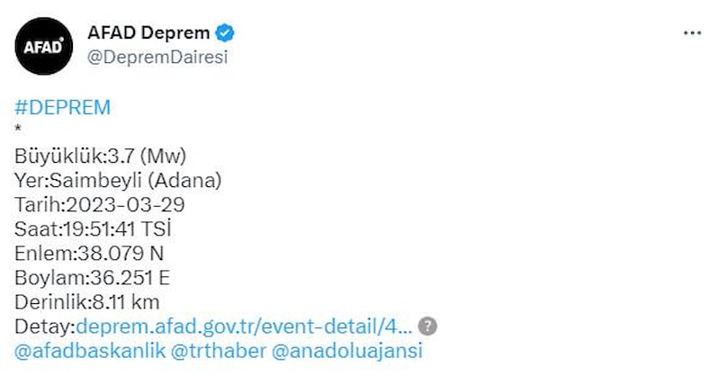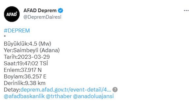 Afet ve Acil Durum Yönetimi Başkanlığından (AFAD) alınan bilgiye göre, saat 19.36'da ve 19.47'de Adana Saimbeyli merkez üssü olan 3.9 ile 4.5 büyüklüğünde deprem meydana geldi.