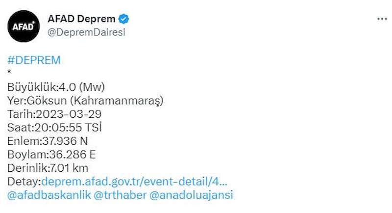 Adana'da Saimbeyli merkez üssü olan 3.9 ile 4.5 büyüklüğünde depremlerin ardından Kahramanmaraş'ta da Göksun ilçe merkezli 4 büyüklüğünde deprem meydana geldi.