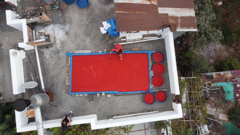 Salça yapımı zor ve meşakkatli. Ben 1,5 ton biber aldım ve ailecek kullanıyoruz. Benim biberim çok olduğu için bir ay sürecek kuruması. Yağmur yağma ihtimaline karşı çadırlarımızı hazırladık. Karıştırdıktan sonra üstünü tülbentlerle örtüyoruz. Kendi salçamızı yaparak hem ne tükettiğimizi biliyoruz hem de daha lezzetli oluyor. Zor bir mesai, günde 10-15 kez güneşte karıştıracağız. Ama zor olsa da severek hazırlıyoruz.