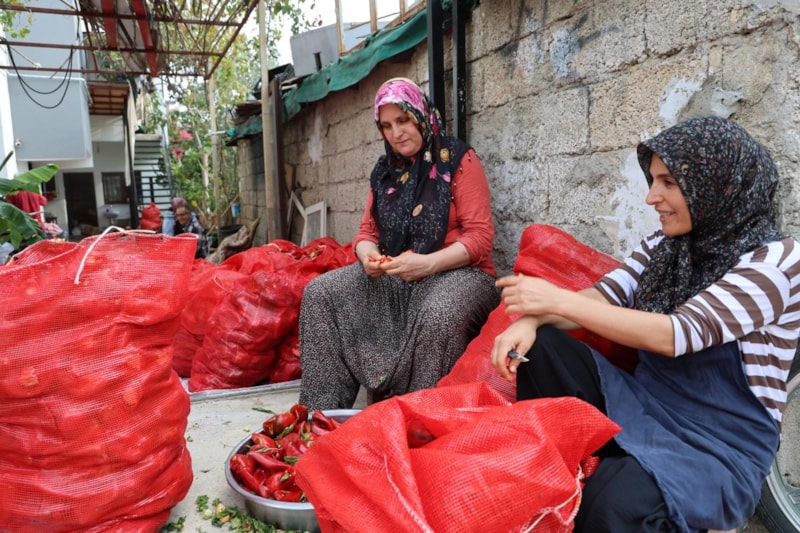 Mahallelerde imece usulü kırmızı salçalık biberleri temizleyip çektiren kadınlar, damlara sermesinden sonra güneş altında eşit şekilde kuruması için günde 10-15 kez karıştırmaya başladı.