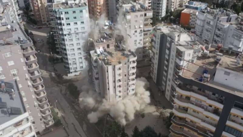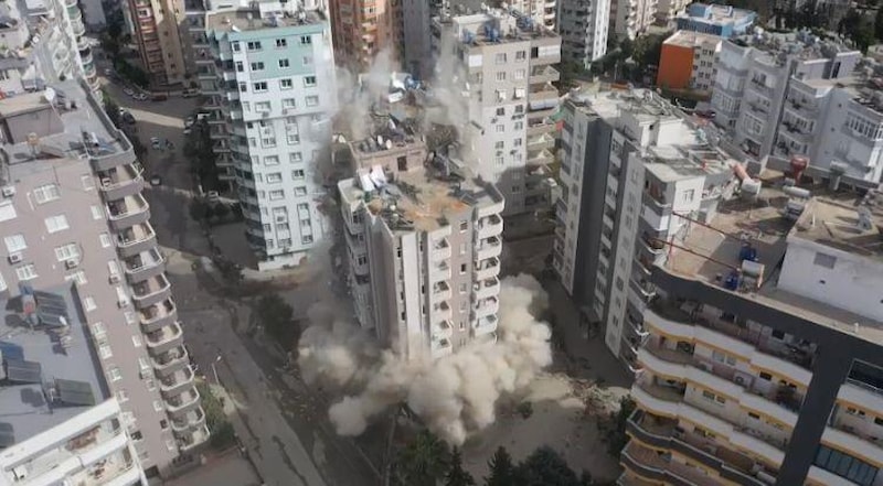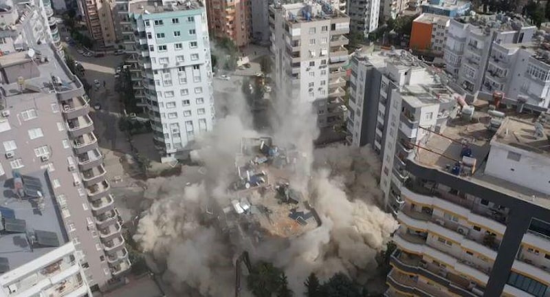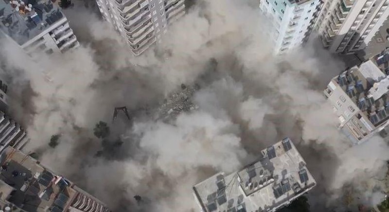 Drone ile görüntülenen yıkımda bina saniyeler içinde yerle bir olurken, binadan geriye toz bulutu kaldı.
