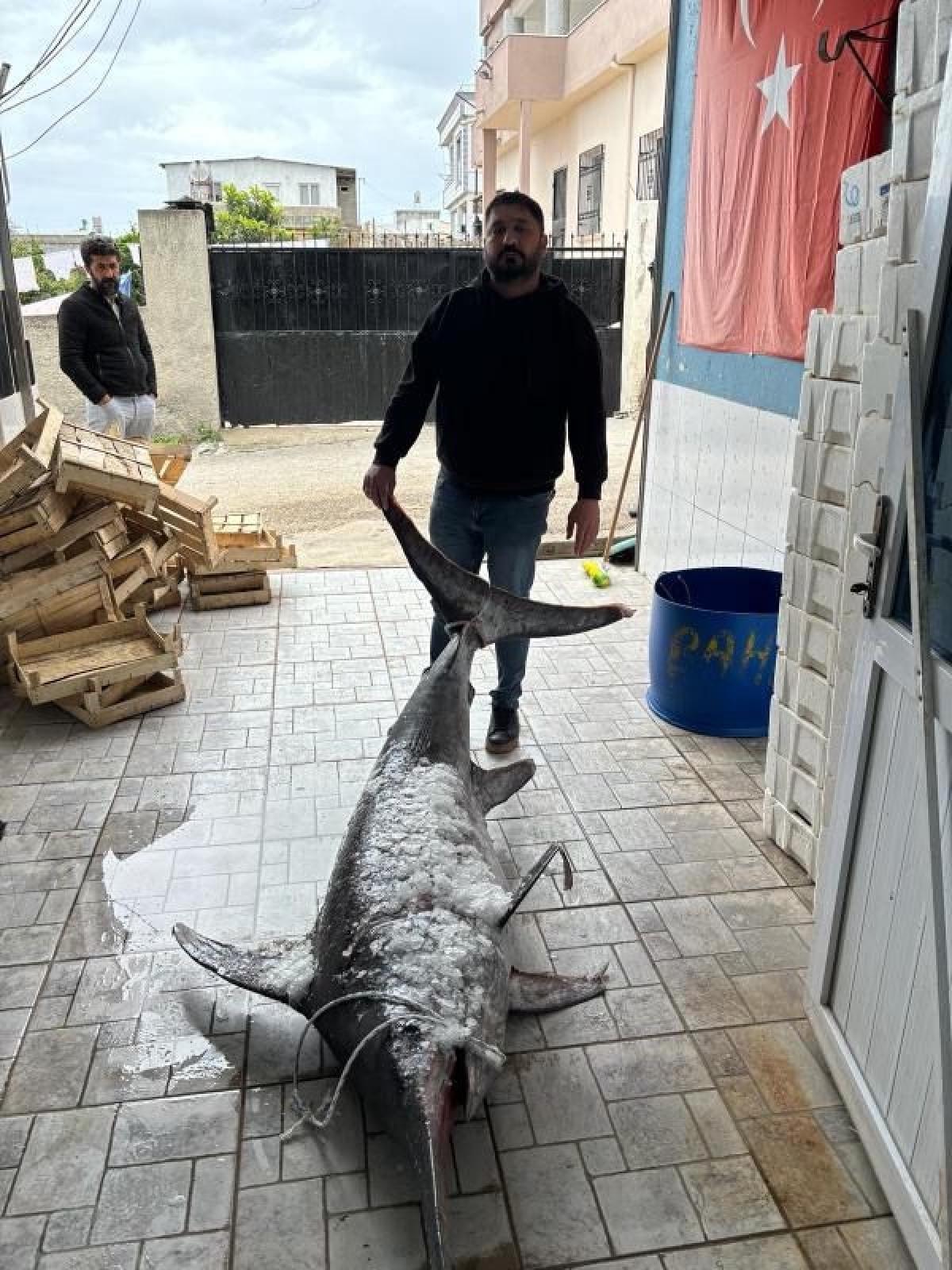Karataş Balıkçı Barınağı'na götürülen dev kılıç balığını görevler gözlerine inanamadı ve balık büyük ilgili gördü.