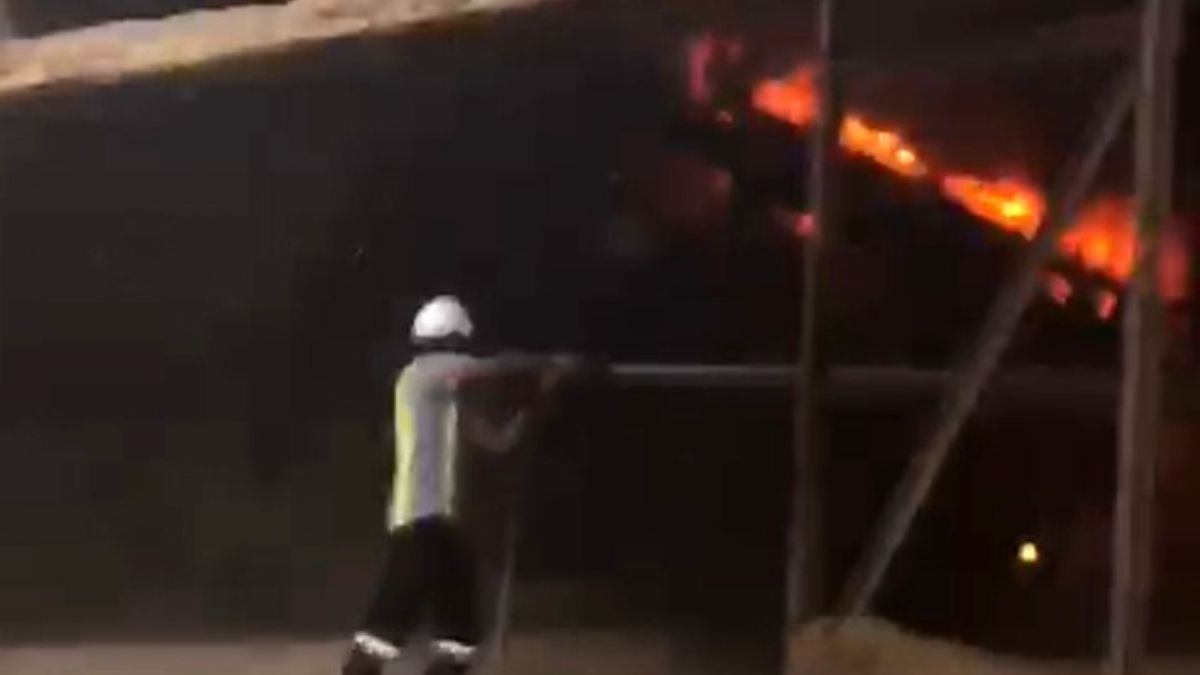 Yangın sırasında fabrika çalışanları, yanmamış ham maddeleri zarar görmemesi için güvenli alana taşıdı.