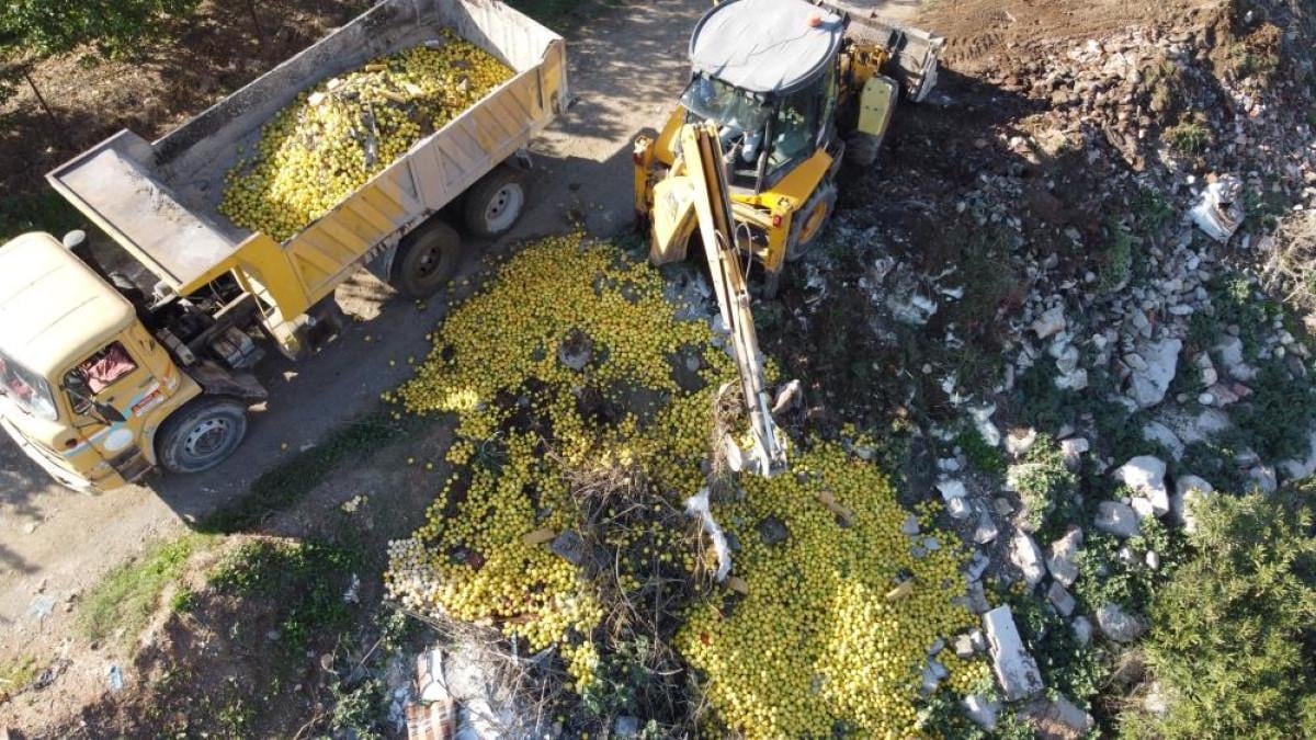 Yaklaşık 10 ton limon ilçe tarım müdürlüğü ekiplerinin gözetiminde imha edilmek üzere kamyona yüklenirken, o anlar havadan görüntülendi.