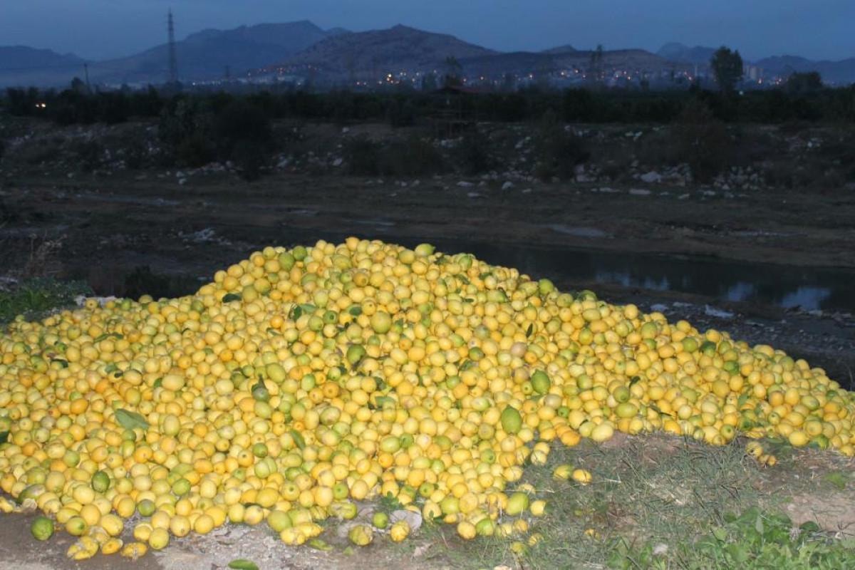 Zincir marketlerde kilosu 12.50 kuruş ila 9.90 TL arasında satılan ve üreticilerin tarlada 30 kuruşa satamadığını iddia ettiği limon para etmeyince dere yatağına döküldü.