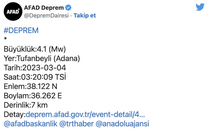 AFAD'dan deprem açıklaması geldi. Adana'nın Tufanbeyli ilçesinde saat 03.20'de 4,1 büyüklüğünde deprem oldu.