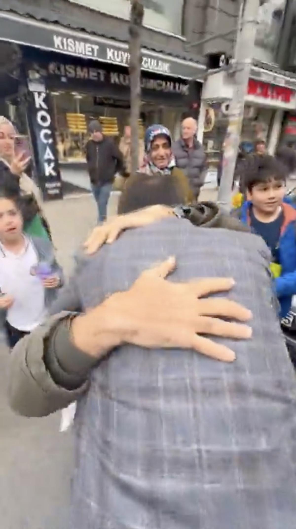 Murat Kurum'u otobüste gören ve yanına çağıran yaşlı bir vatandaş, sıkı sıkı sarılmadan bırakmadı.