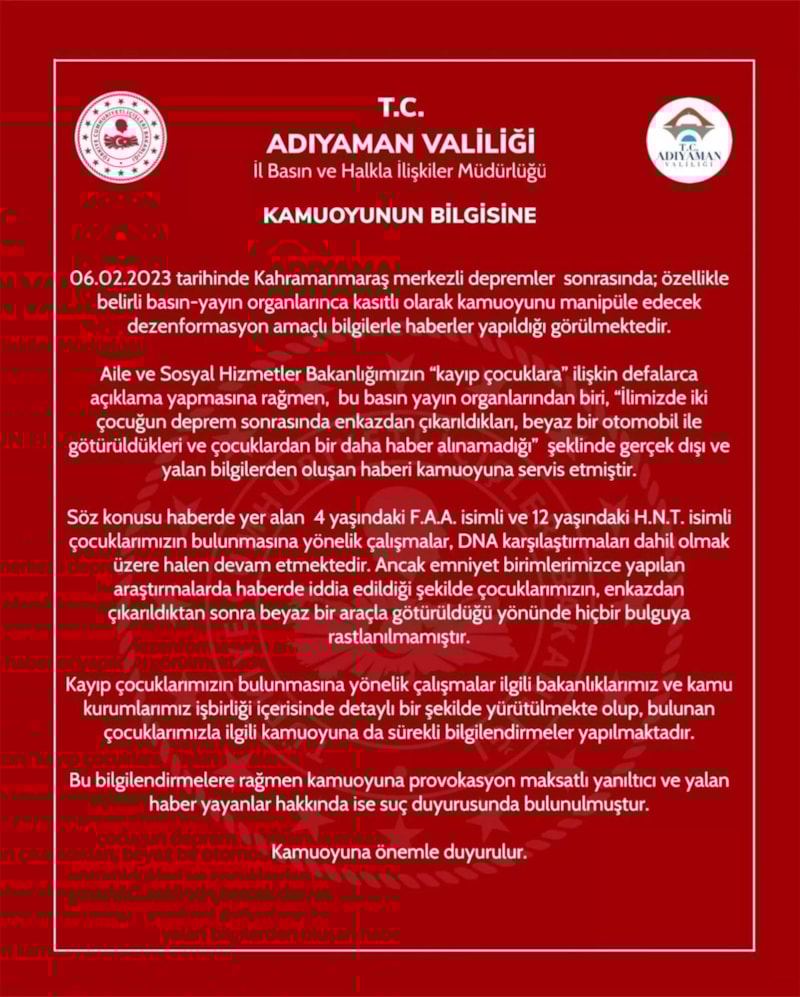 'İki çocuğun enkazdan çıkarıldıktan sonra beyaz bir araçla götürüldüğü ve kendilerinden bir daha haber alınamadığı' şeklindeki haber hakkında Adıyaman Valiliği'nden açıklama geldi. "Kamuoyuna provokasyon maksatlı yanıltıcı ve yalan haber yayanlar hakkında ise suç duyurusunda bulunulmuştur" denildi.