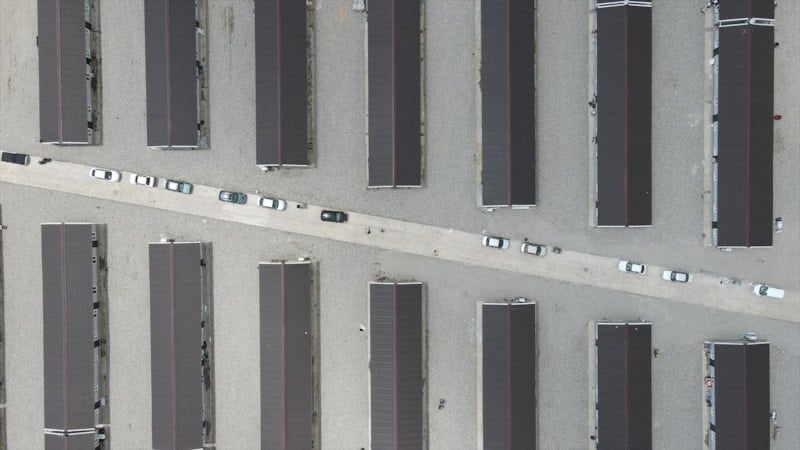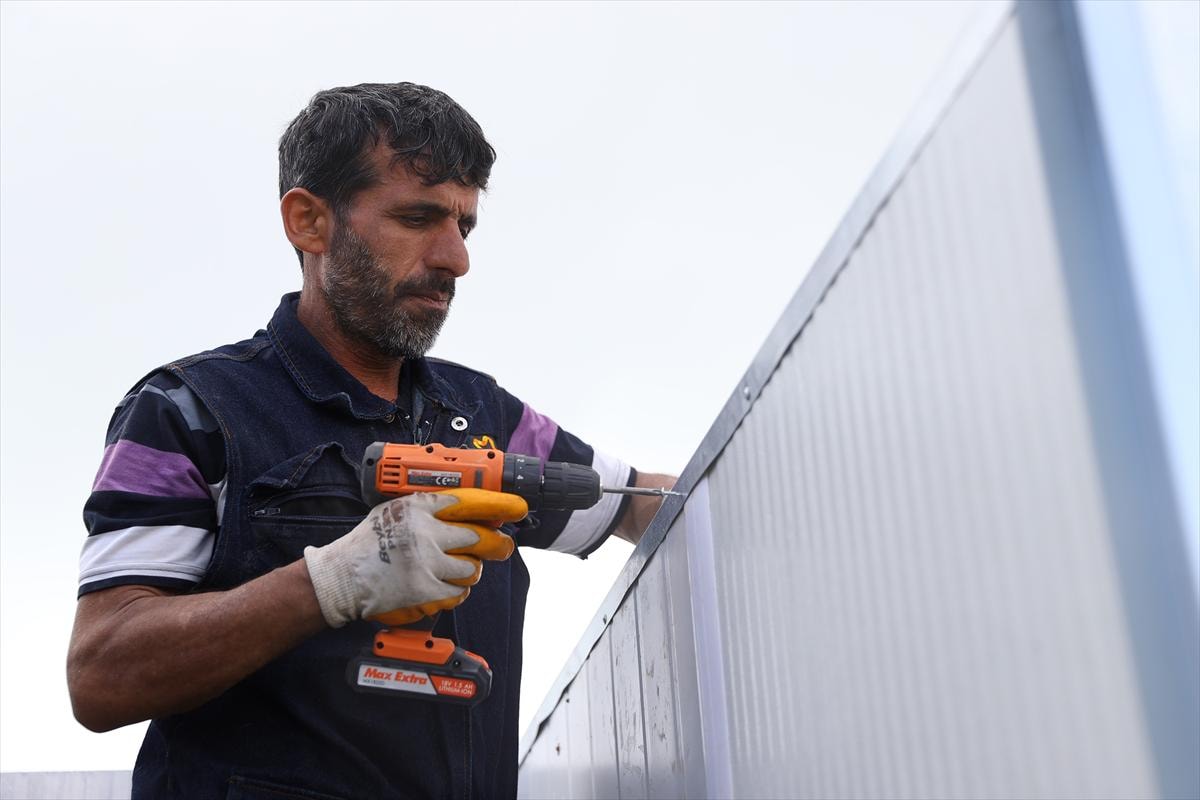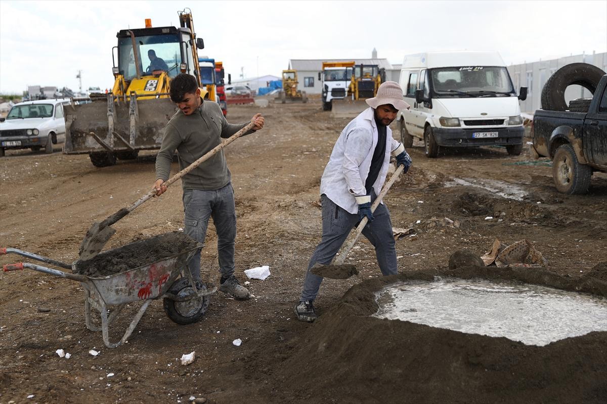 Depremlerde evleri yıkılan ya da ağır hasar gören afetzedeler için Kavaklıdere Mahallesi'ndeki 2 bin 550 prefabrik yapının yer alacağı geçici yaşam merkezinde çalışan işçiler, prefabrik kentin çalışmasına ara vermeden sürdürdü.