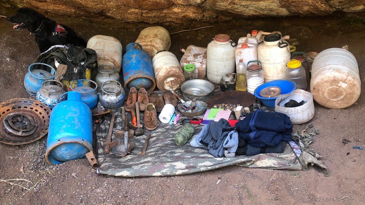 AA’nın haberine göre; yapılan arama tarama faaliyetinde, toprağa gömülü 2 büyük tüp, 5 piknik tüpü, kıyafet ve yaşam malzemeleri ele geçirildi.