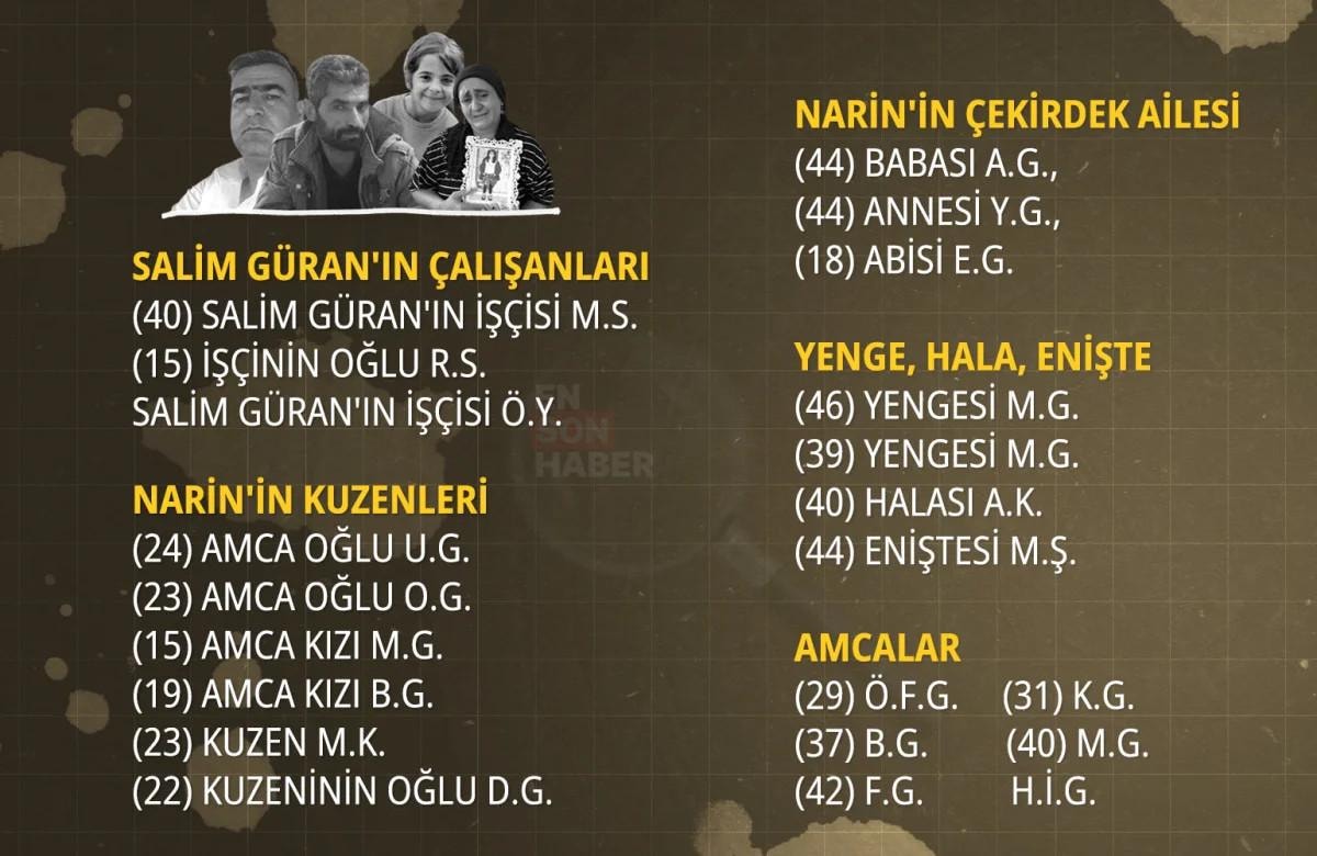 Narin’in amca oğulları U.G. (24) ve O.G. (23) ile amca kızları M.G. (15) ve B.G. (19) de gözaltında bulunan isimler arasında yer alıyor.