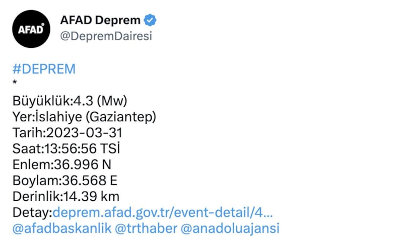 AFAD'ın verilerine göre, İslahiye ilçesinde 4.3 büyüklüğünde deprem yaşandı.