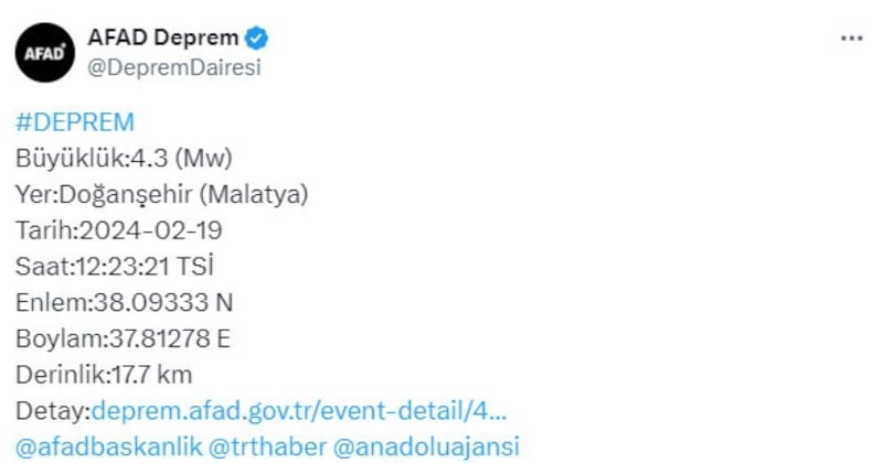 AFAD, depremin merkez üssü olarak Doğanşehir ilçesini işaret etti.
