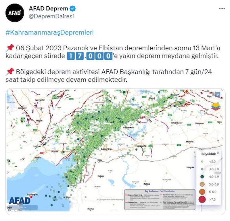 06 Şubat 2023 Pazarcık ve Elbistan depremlerinden sonra 13 Mart'a kadar geçen sürede 17 bine yakın deprem meydana gelmiştir.