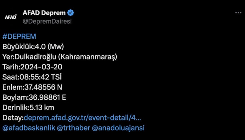 Asrın felaketinin merkezi olan Kahramanmaraş'ta, merkez üssü Dulkadiroğlu ilçesi olan 4.0 büyüklüğünde bir deprem meydana geldi.