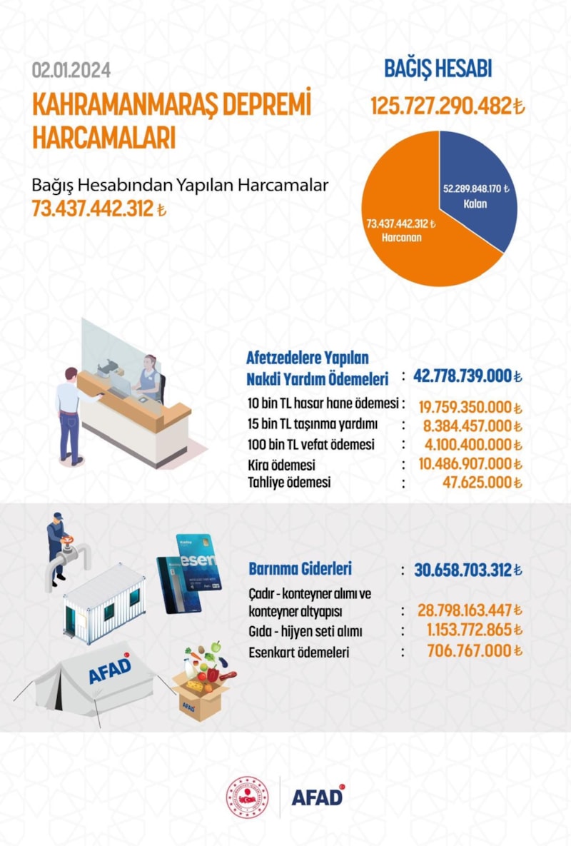 AFAD'ın bağış hesabında toplanan 125 milyar 727 milyon 290 bin 482 liranın yaklaşık 73,5 milyar lirasının, Kahramanmaraş merkezli depremlerden etkilenen afetzedelere ulaştırıldığı ifade edildi.