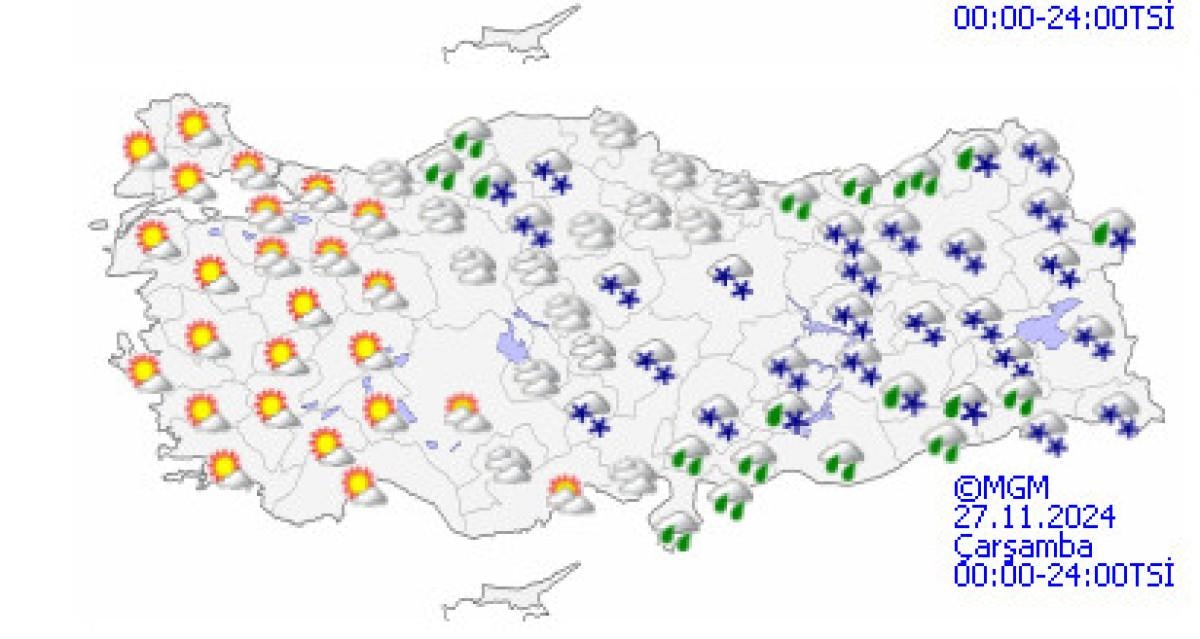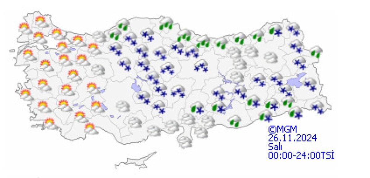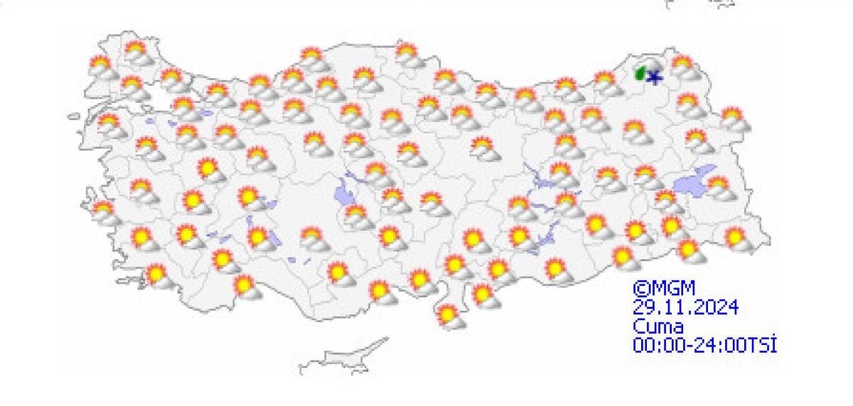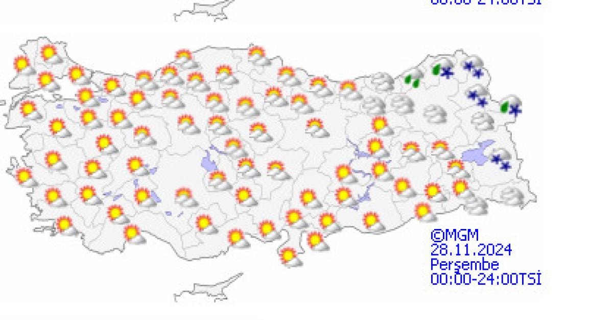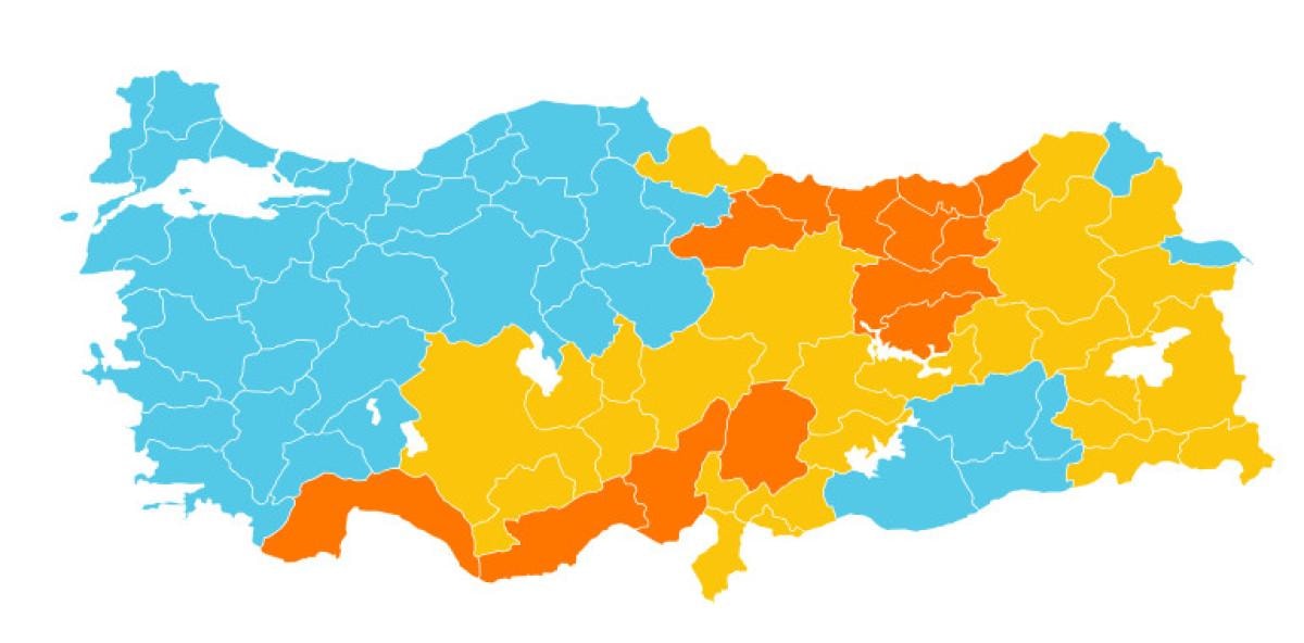 24 Kasım (Pazar) tarihinde; 35 ilimize Sarı Uyarı 20 ilimize (Antalya, Bolu, Erzincan, Gümüşhane, Rize, Sivas, Trabzon, Bayburt, Bartın, Düzce, Giresun, Kastamonu, Ordu, Tokat, Tunceli, Zonguldak, Karabük, Adana, Mersin, Kahramanmaraş) Turuncu Uyarı