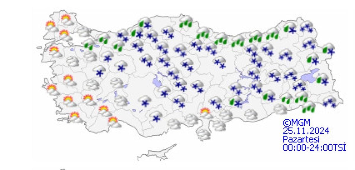 25 Kasım (Pazartesi) tarihinde;25 ilimize Sarı Uyarı13 ilimize (Adana, Antalya, Erzincan, Giresun, Ordu, Tokat, Tunceli, Bayburt, Gümüşhane, Mersin, Kahramanmaraş, Rize, Trabzon) Turuncu Uyarı verilmiştir.