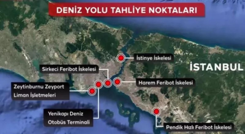 Deniz yoluyla tahliyeler için altı stratejik nokta hazır: Sirkeci Feribot İskelesi, Yenikapı Deniz Otobüs Terminali, Pendik Hızlı Feribot İskelesi, İstinye İskelesi, Harem Feribot İskelesi ve Zeytinburnu Zeyport Liman İşletmeleri.