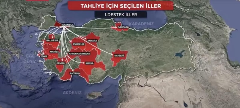 Depremzedelerin tahliye edileceği iller iki grupta sınıflandırılmış. İlk grupta Balıkesir, Eskişehir, Ankara, Manisa, İzmir, Afyonkarahisar, Konya, Antalya, Denizli, Samsun ve Kayseri yer alıyor.