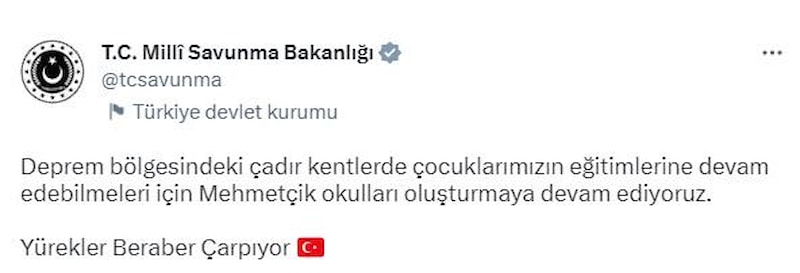 Milli Savunma Bakanlığı, güvenlik güçlerinin minik depremzedelerin eğitimi için çadır kentlerde Mehmetçik Okulları oluşturduğunu paylaştı.