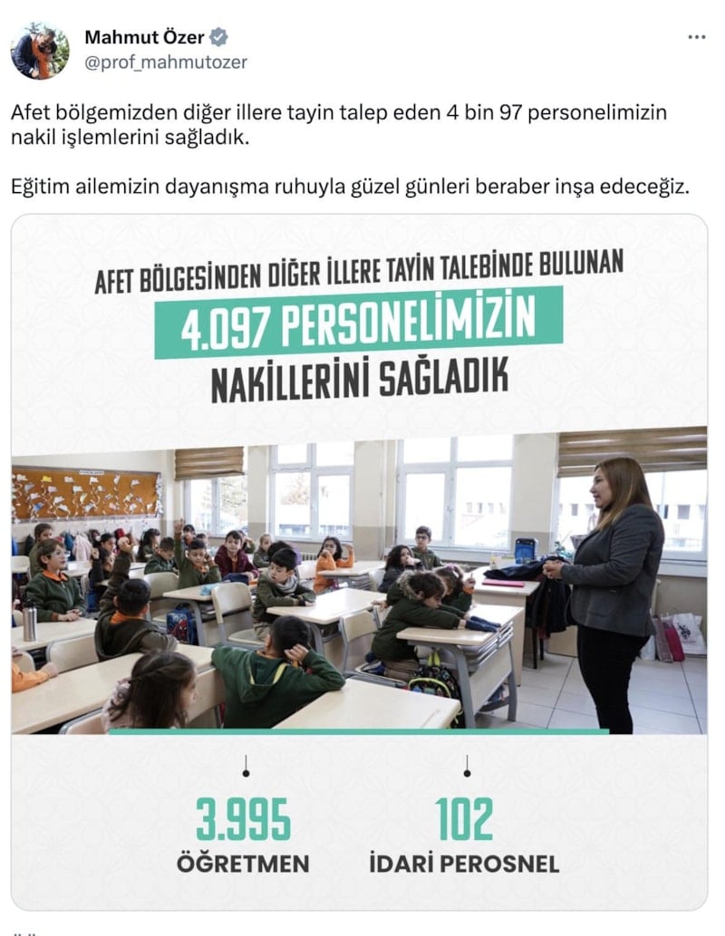 Milli Eğitim Bakanı Mahmut Özer, afet bölgesinde görevli olan 4 bin 97 eğitim personelli farklı illere nakil edildiğini bildirdi.