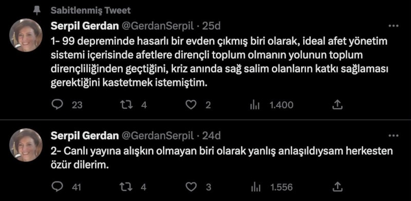 Öte yandan Doç. Dr. Serpil Gerdan yayında kullandığı ifadeler sonrası Twitter hesabından bir açıklama yaptı.