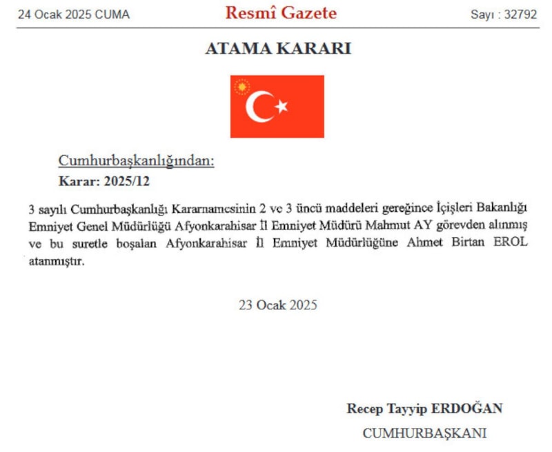 Karara göre, Afyonkarahisar İl Emniyet Müdürü Mahmut Ay görevden alındı.