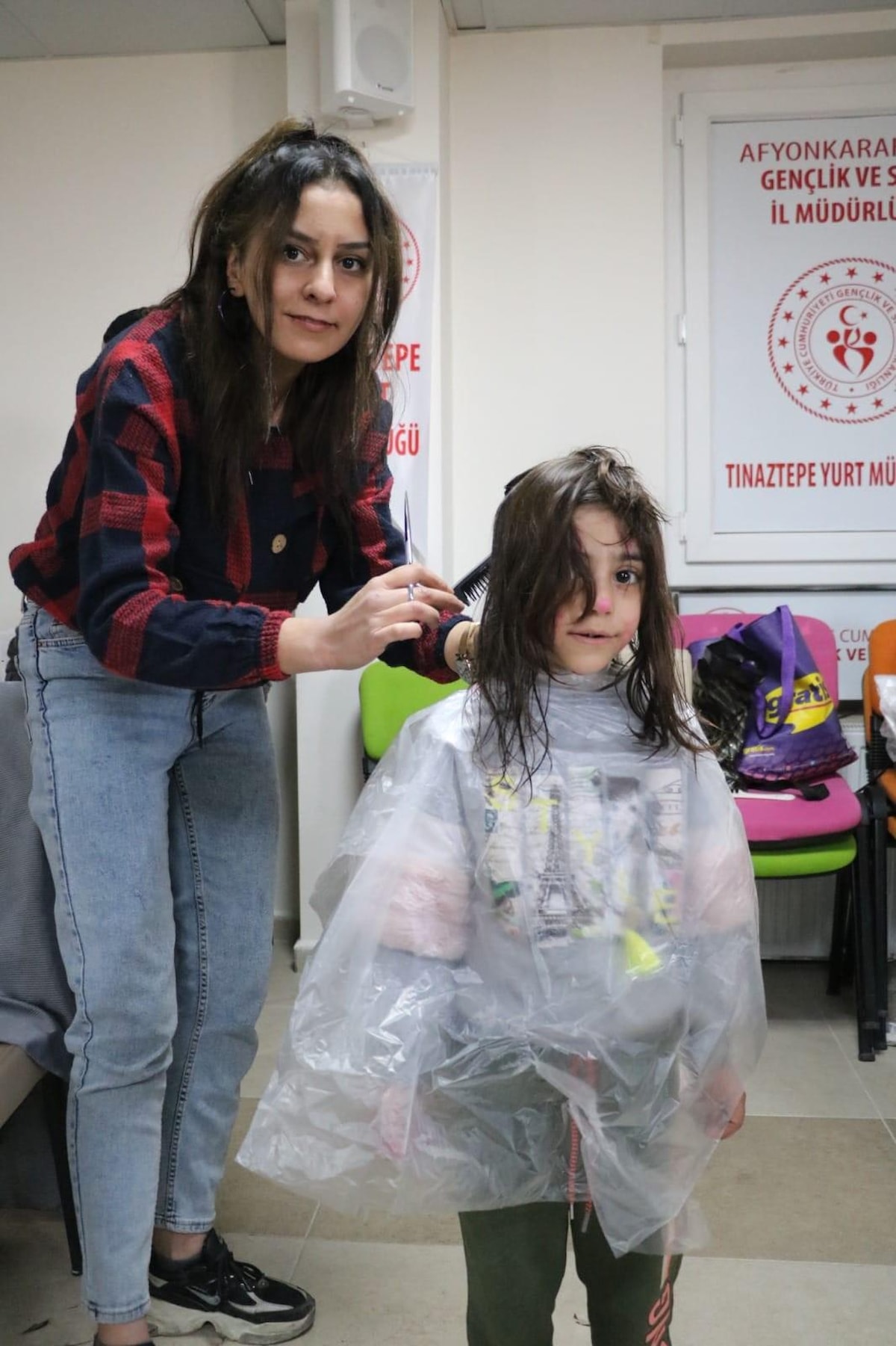 Kentte, depremzede kadın ve çocuklara Berberler ve Kuaförler Odası üyesi 65 kadın kuaför, ücretsiz saç kesimi ve cilt bakımı yaptı.