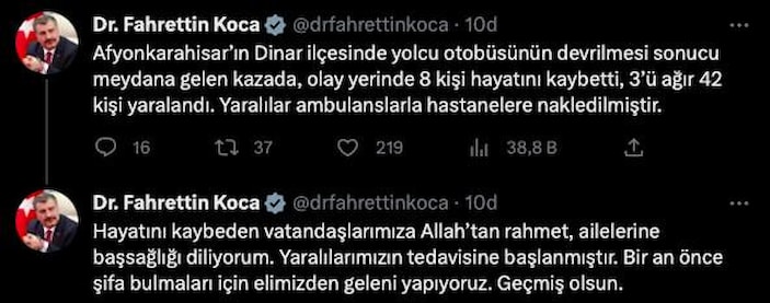 Afyonkarahisar’ın Dinar ilçesinde yolcu otobüsünün devrilmesi sonucu meydana gelen kazada, olay yerinde 8 kişi hayatını kaybetti, 3’ü ağır 42 kişi yaralandı. Yaralılar ambulanslarla hastanelere nakledilmiştir. Hayatını kaybeden vatandaşlarımıza Allah’tan rahmet, ailelerine başsağlığı diliyorum. Yaralılarımızın tedavisine başlanmıştır. Bir an önce şifa bulmaları için elimizden geleni yapıyoruz. Geçmiş olsun.