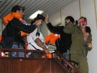 Tel Aviv'de gece yatağımdan kaldırıp 2.5 saat sorguladılar. Gemide, bir elim askerin üzerinde bir elim ‘Durun' şeklinde gösteren fotoğrafımı bulmuşlar. Yanımda gaz maskeli eylemcilerden birinin fotoğrafını göstererek, ‘Tamam sen burada bir iyilik yapıyorsun ama yanındaki vuruyor' dediklerinde, ‘Herkese mani olamam ama elimden geldiğince vurdurtmadım. Üç askeri çağırın yüz yüze görüşebilirim' dedim. ‘Peki bunlara nasıl gücün yetti?' dediler. ‘Müslümanlıkta esire kötü davranılmaz' dedim.