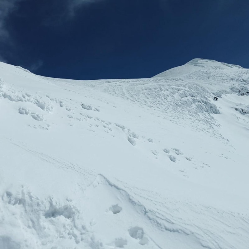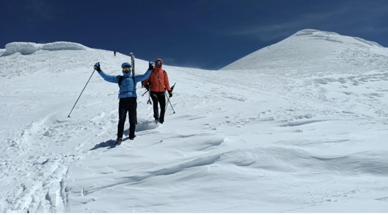 Zirveye çıkan dağcılar bahar ayında karla kaplı olan zirvede kayak yaparak hem zirvenin hem de doğanın tadını çıkardı.