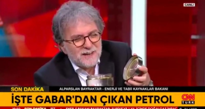 Ahmet Hakan canlı yayında Bakan Bayraktar'ın Gabar'dan getirdiği kavanoza konmuş petrolü izleyicilere göstererek "Böyle sıvı mı olur?" diye sordu.