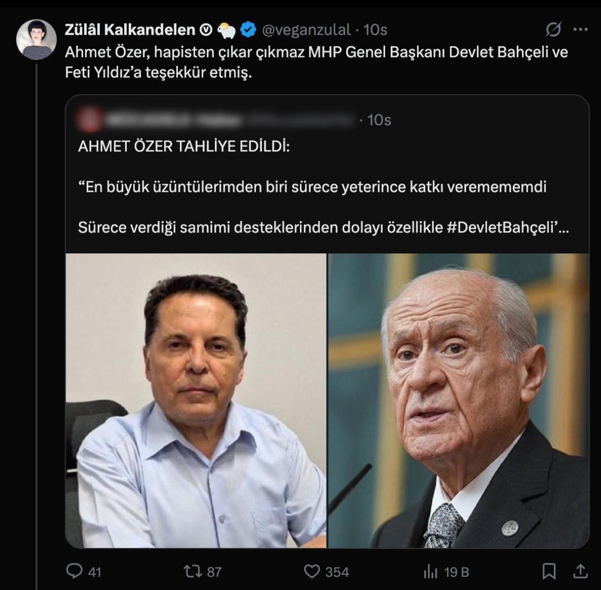 Bir başka isim Zülal Kalkandelen ise, "Ahmet Özer, hapisten çıkar çıkmaz MHP Genel Başkanı Devlet Bahçeli ve Feti Yıldız'a teşekkür etmiş." sözleriyle Özer'in açıklama yaptığı görüntüleri paylaştı.