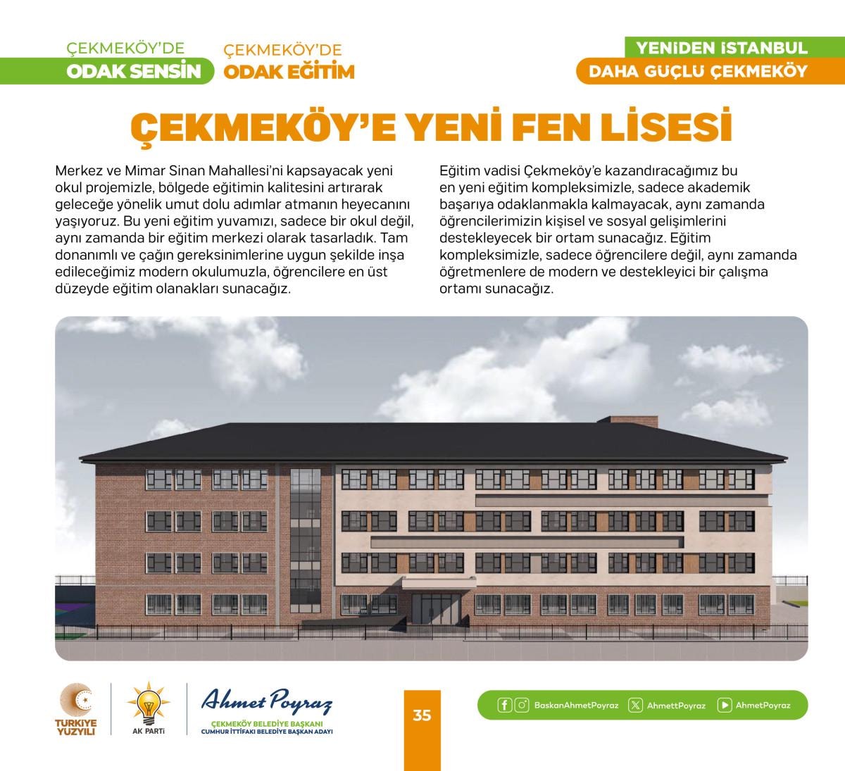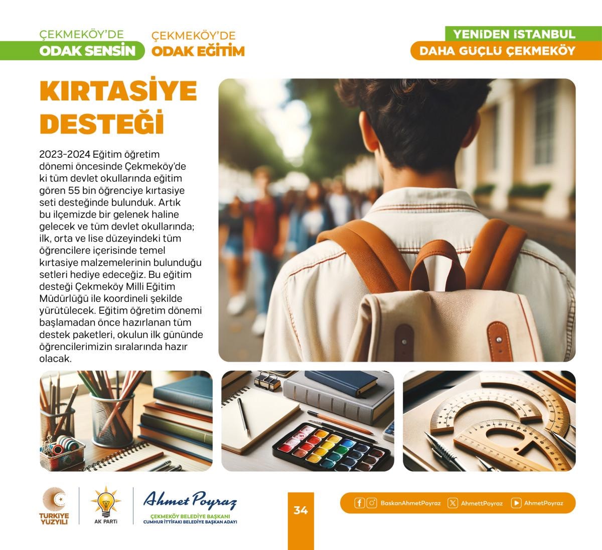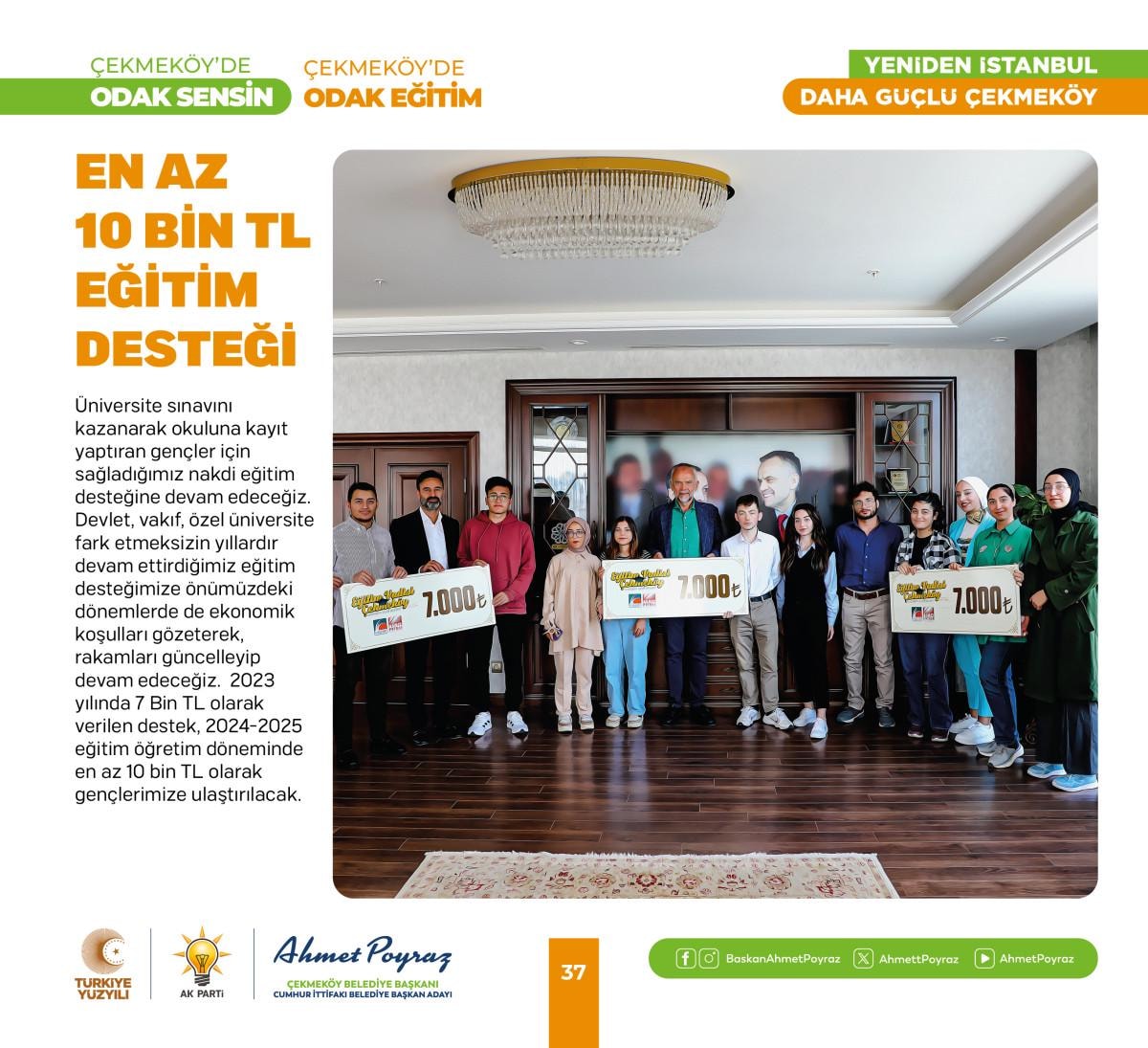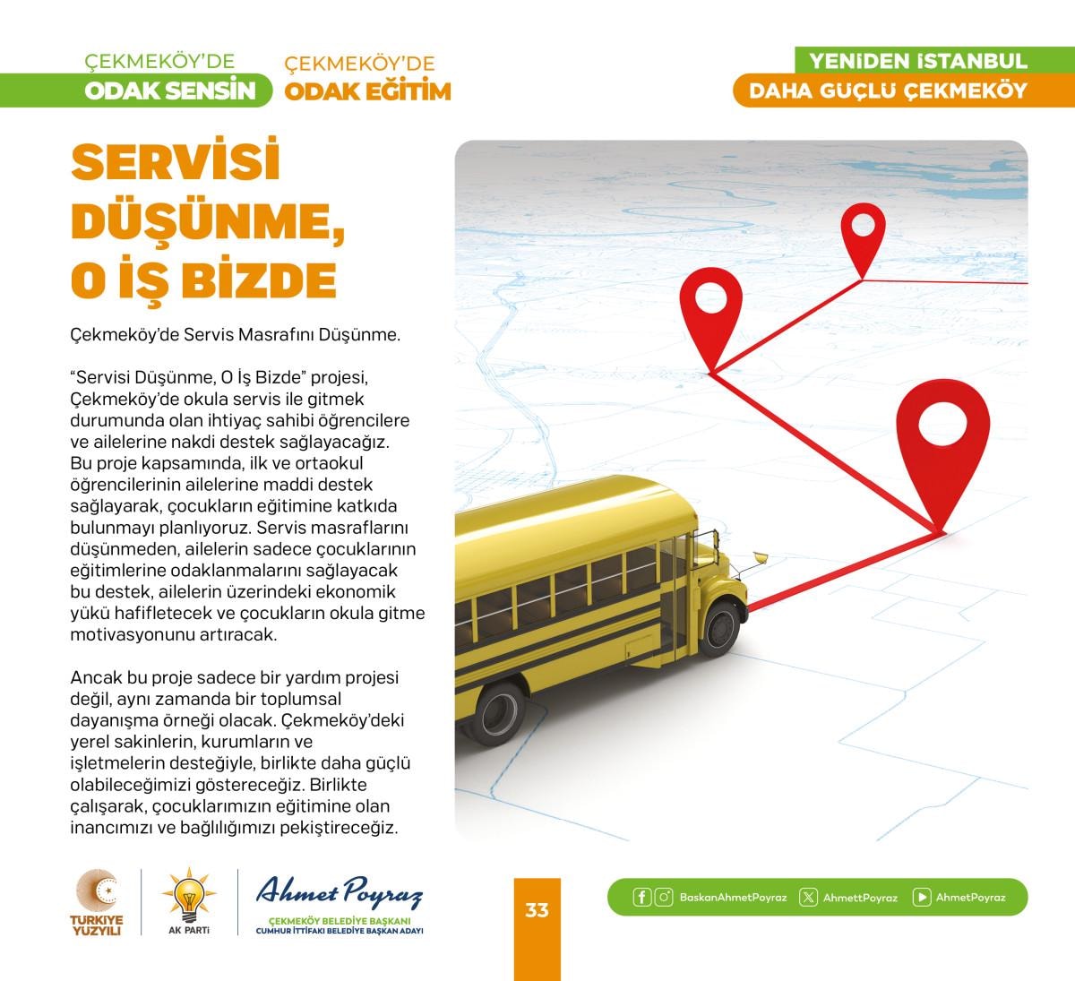 Birçok eğitim projesine imza atan Çekmeköy Belediye Başkanı Ahmet Poyraz, üniversiteyi kazanan gençlere; nakdi eğitim desteği, istanbulkart desteği, devlet okullarında tüm öğrencilere kırtasiye seti, dijital dershane hediyesi gibi birçok projesine önümüzdeki yıllarda da devam edecek. Başkan Poyraz’ın yeni dönem projeleri içinde; spor, sanat ve eğitim alanında değerli projeler bulunuyor. Eğitim projeleri içerisinde yer alan servis desteği projesi ise birçok yerel yönetime örnek teşkil edecek bir proje niteliği taşıyor.