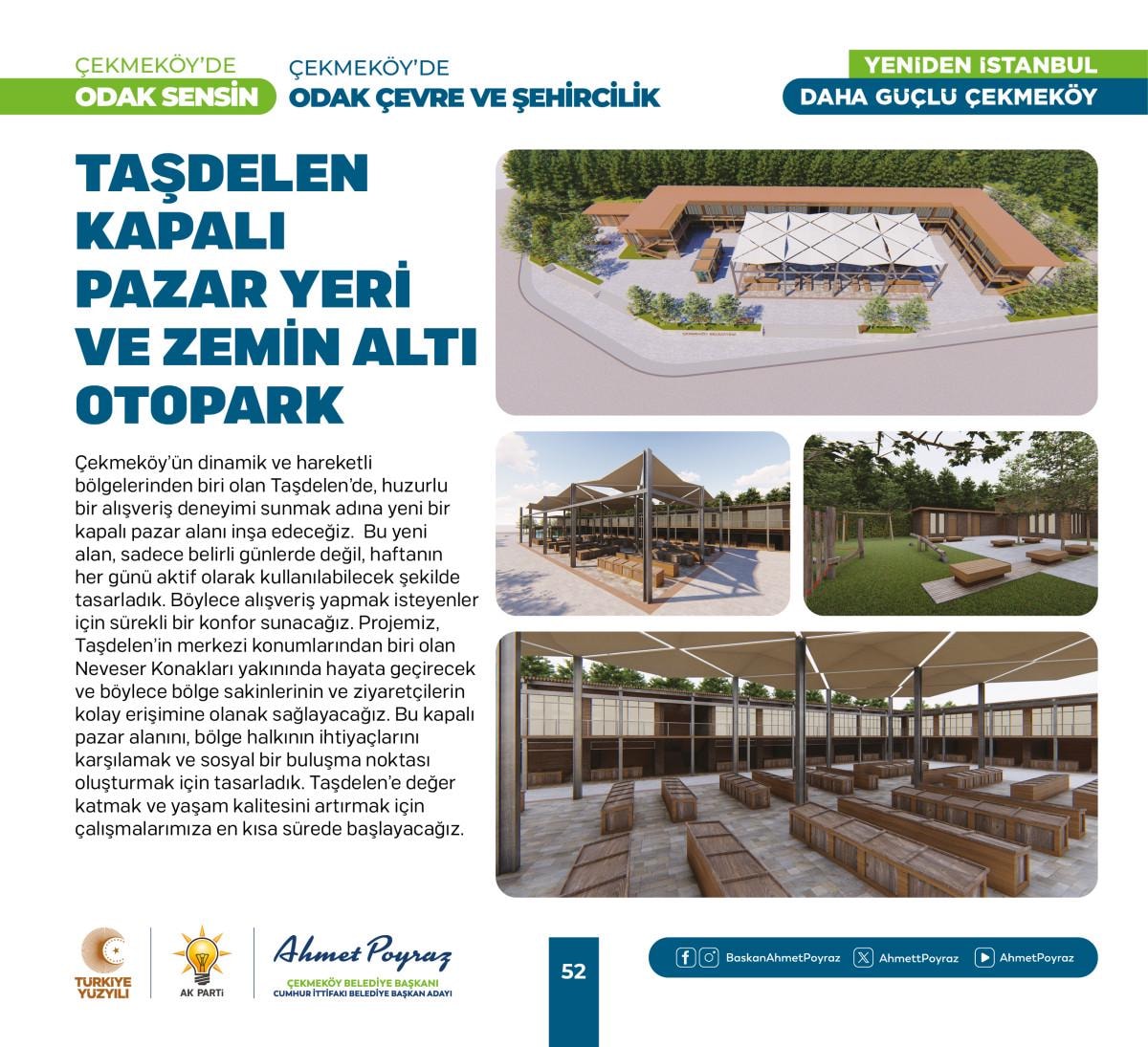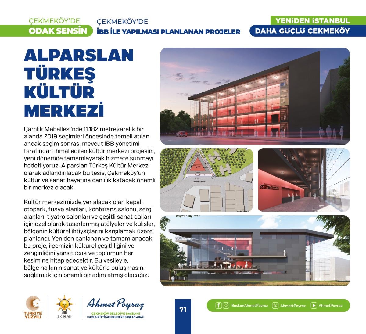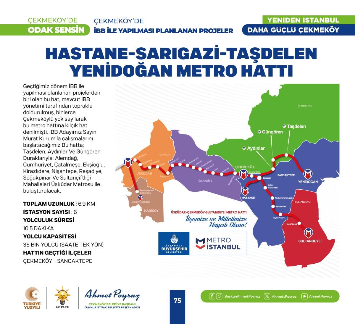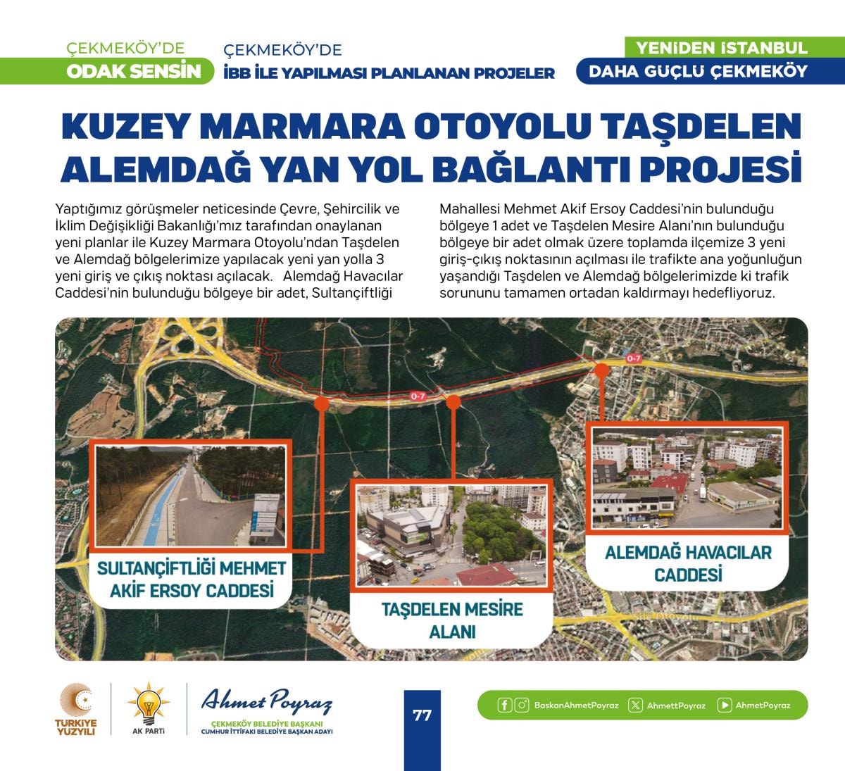 2019 seçimi öncesi yapım çalışmaları başlayan seçim sonrası kaderine terk edilen Alparslan Türkeş Kültür Merkezi’mizi yeni dönemde tamamlayacağız. İmamoğlu’nun kılçık deyip toprakla doldurduğu 150 binden fazla insanın ulaşımını direkt ilgilendiren Taşdelen Metro hattımız açacağız. Kuzey Marmara Otoyolu Taşdelen Alemdağ Yan Yol Bağlantı Projesiyle ilçemize 3 yeni giriş çıkış noktası kazandıracağız, ayrıca Yeşil Yol adını verdiğimiz projemizle Merkez Mahalleleri ve Taşdelen Mahallelerini birleştireceğiz. Köy Konakları, Gençlik ve Eğitim Kamp Merkezi, Taşdelen Meydan ve Yer Altı Otoparkı Projesi ve Odak Çekmeköy projesiyle ilçemize yeni sosyal donatı alanları kazandıracağız.” dedi.