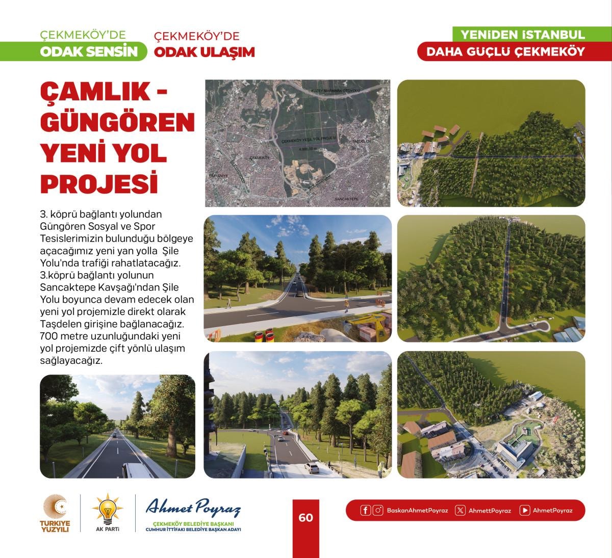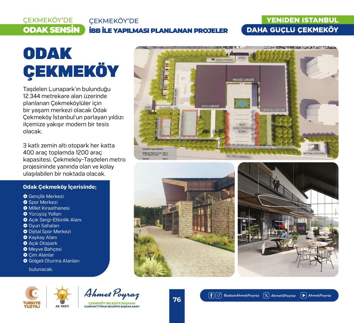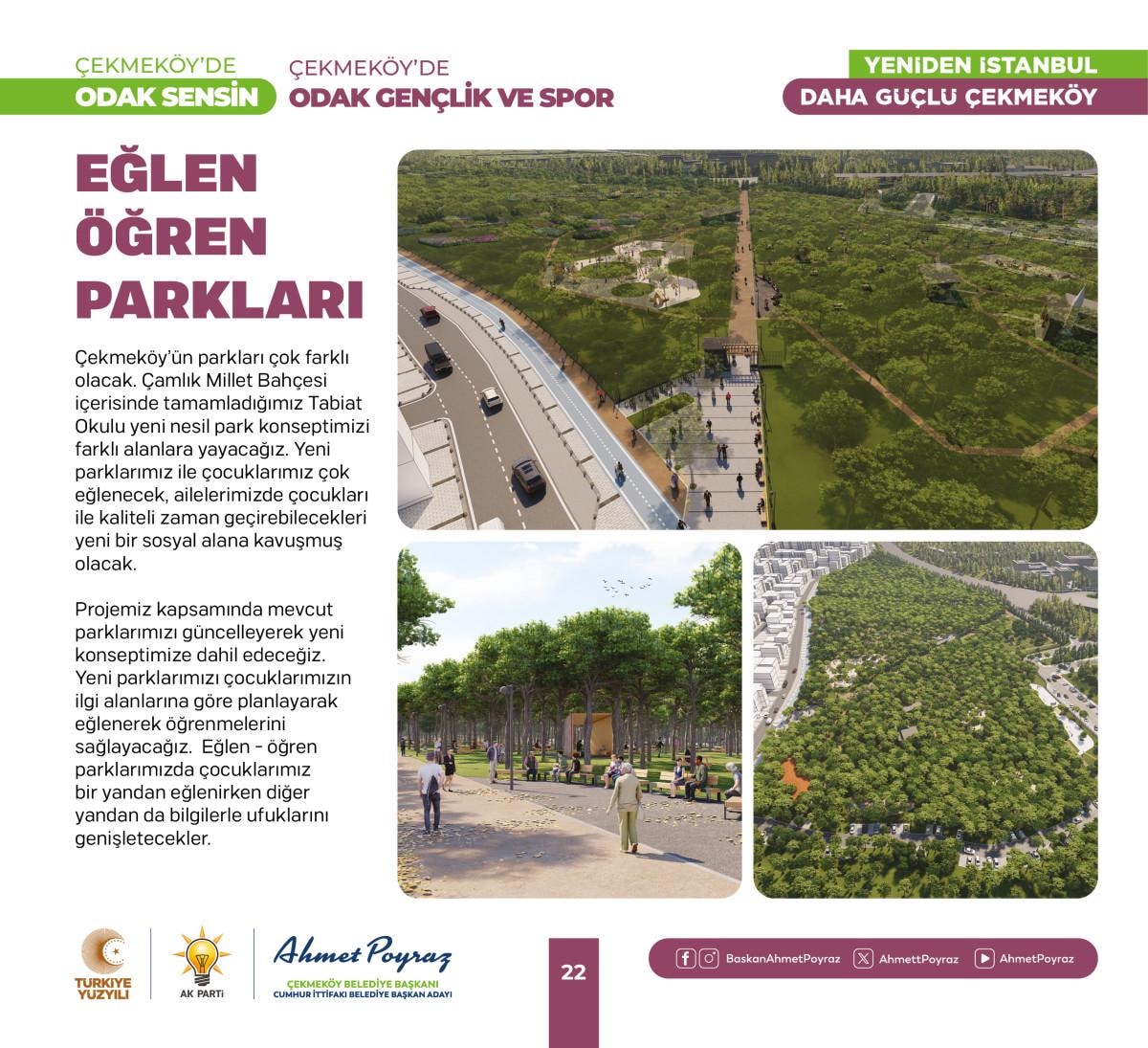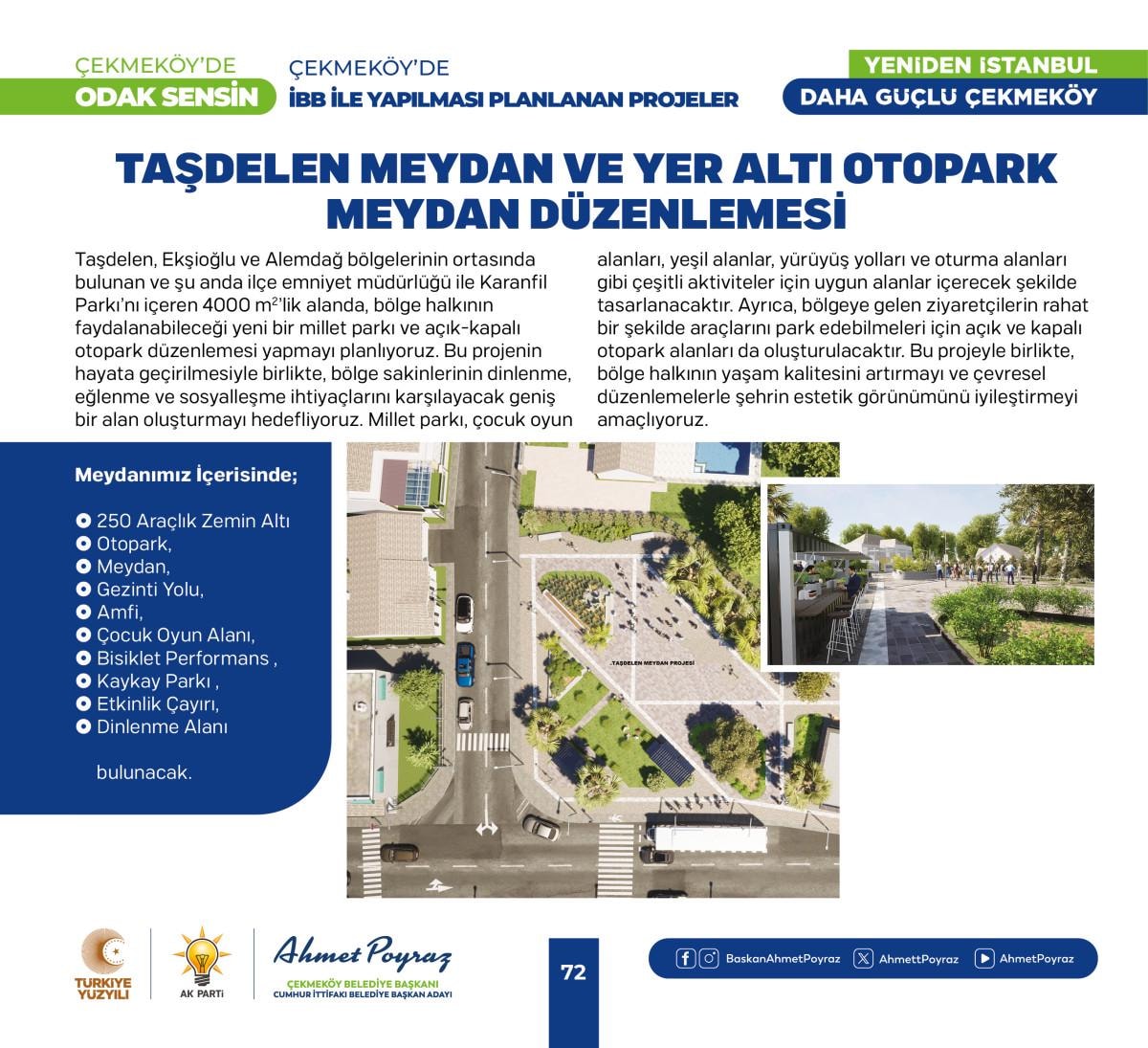 2019 seçimi öncesi yapım çalışmaları başlayan seçim sonrası kaderine terk edilen Alparslan Türkeş Kültür Merkezi’mizi yeni dönemde tamamlayacağız. İmamoğlu’nun kılçık deyip toprakla doldurduğu 150 binden fazla insanın ulaşımını direkt ilgilendiren Taşdelen Metro hattımız açacağız. Kuzey Marmara Otoyolu Taşdelen Alemdağ Yan Yol Bağlantı Projesiyle ilçemize 3 yeni giriş çıkış noktası kazandıracağız, ayrıca Yeşil Yol adını verdiğimiz projemizle Merkez Mahalleleri ve Taşdelen Mahallelerini birleştireceğiz. Köy Konakları, Gençlik ve Eğitim Kamp Merkezi, Taşdelen Meydan ve Yer Altı Otoparkı Projesi ve Odak Çekmeköy projesiyle ilçemize yeni sosyal donatı alanları kazandıracağız.” dedi.