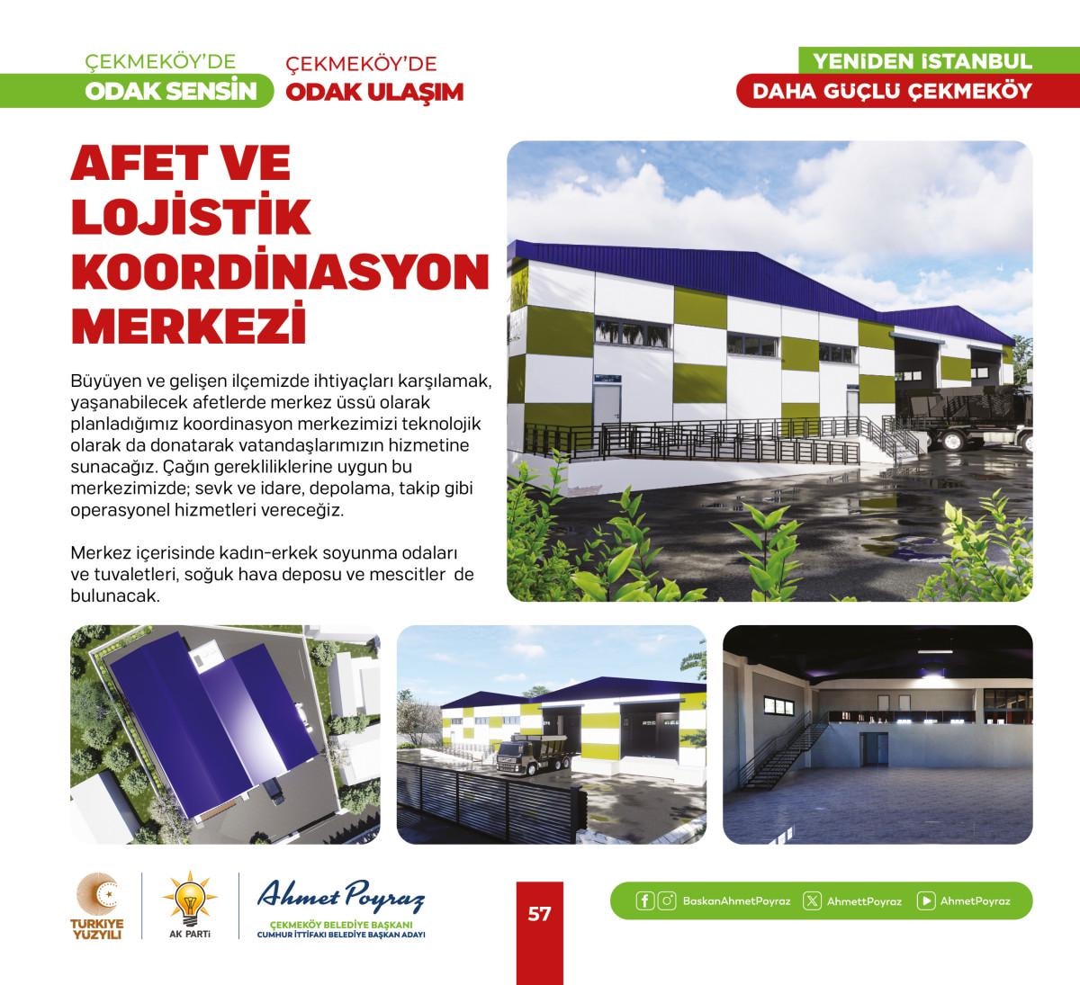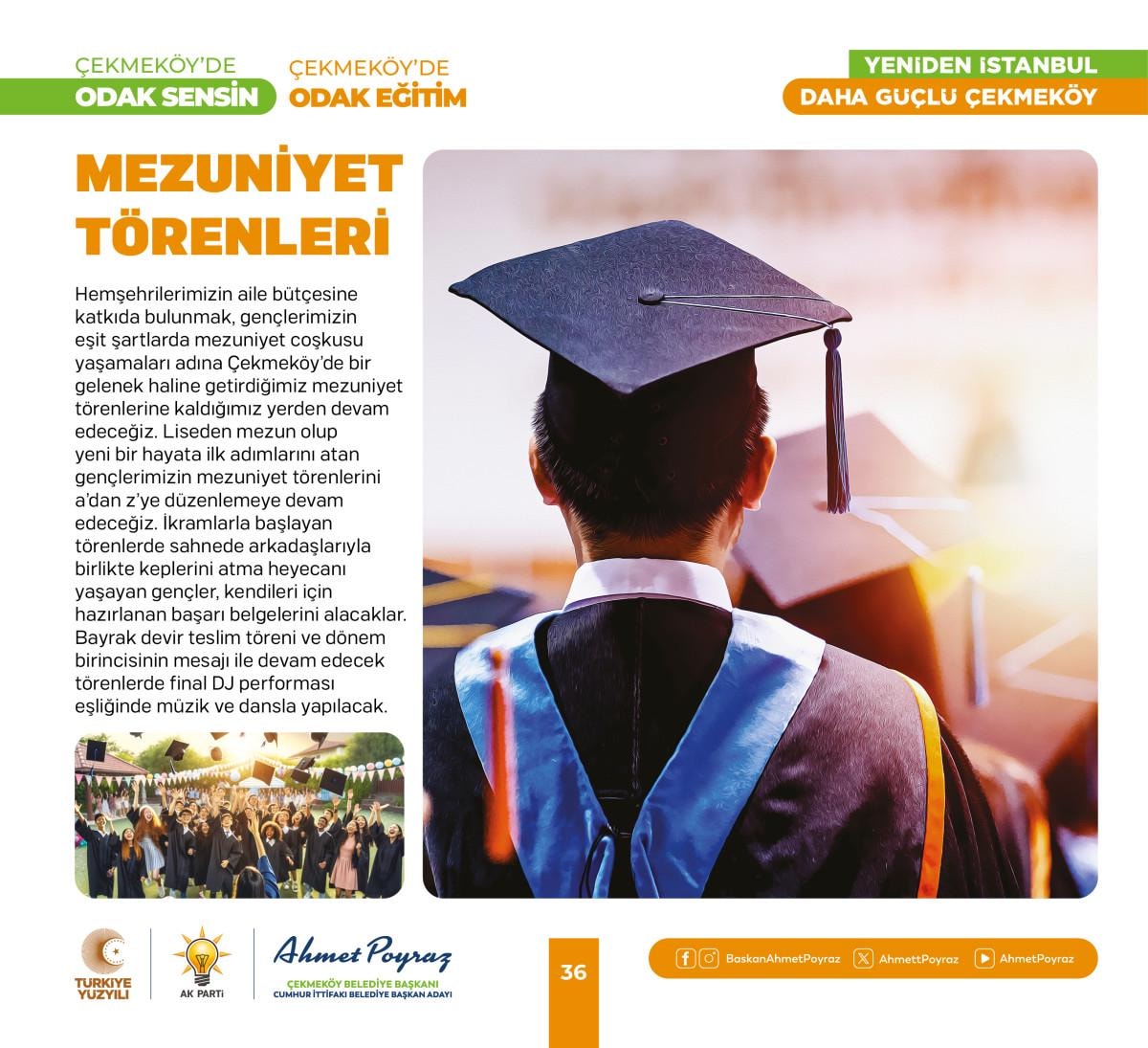 Programda projelerin tanıtımı ardından salonda bulunan vatandaşlara seslenen Çekmeköy Belediye Başkanı Ahmet Poyraz; “Büyük Çekmeköy ailem; hayatın her alanında; sizin önceliklerinizin merkezinde olduğu bir yönetim anlayışıyla Çekmeköy’ümüze hizmet ediyoruz. "Çekmeköy'de Odak Sensin" sloganıyla başlattığımız bu yeni yolculukta, bugüne kadar olduğu gibi bundan sonrada sizlerin sesine kulak vererek, ihtiyaç ve beklentilerinizi en üst düzeyde karşılamayı hedefliyoruz. Her bir projeyi, Çekmeköy'ümüzün daha yaşanabilir, daha yeşil, daha güvenli ve daha modern bir ilçe olması için titizlikle hazırladık. Projelerimiz, eğitimden sağlığa, gençlik ve spordan kültür ve sanata, ulaşımdan çevre düzenlemelerine kadar geniş bir yelpazeyi kapsıyor. 15 yıl önce bayrağı devraldığımızda verdiğimiz tüm sözleri nasıl bir bir yerine getirdiysek, bugün bu kitapçıkta yer alan her bir projeyi harfiyen yerine getirecek ve şehrimizin marka değerini artıracağız.