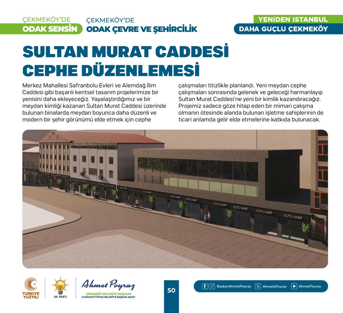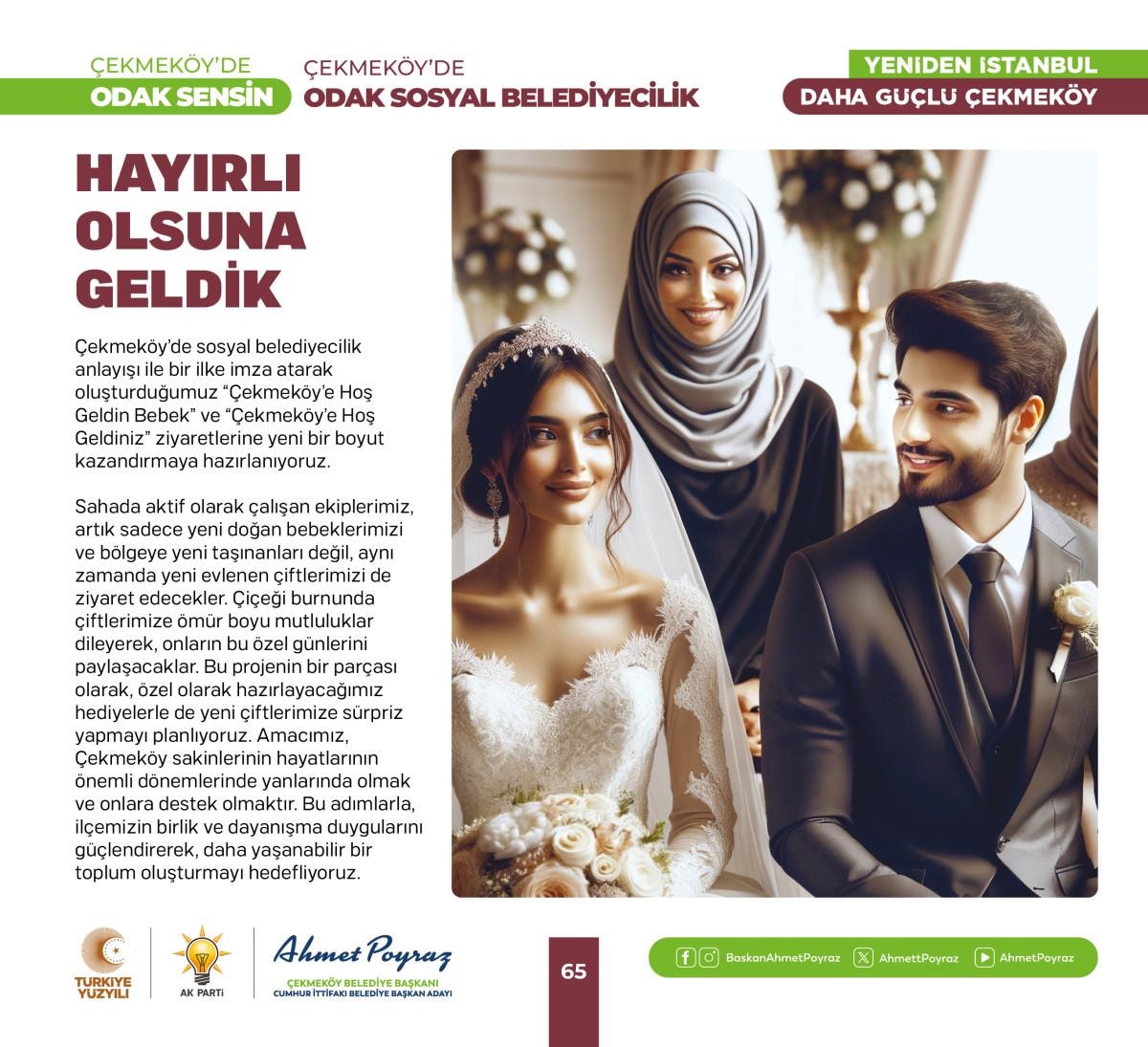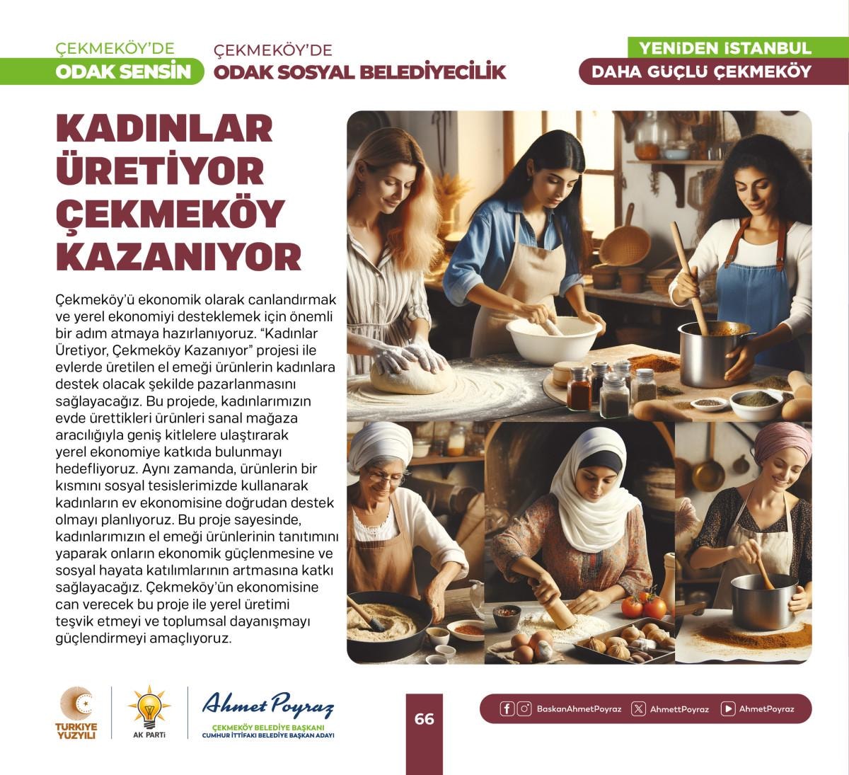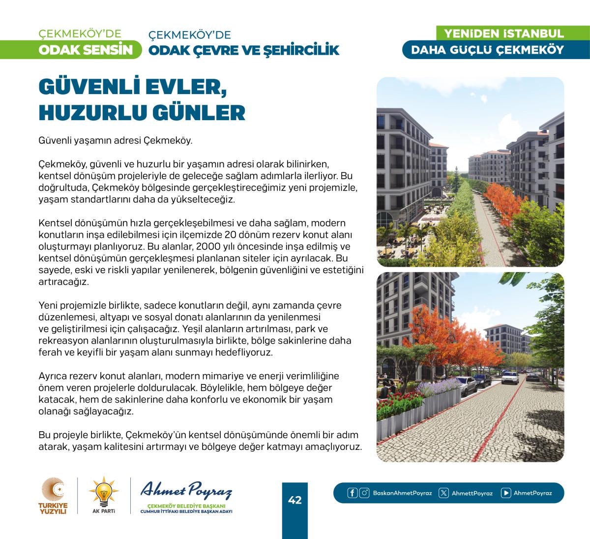 Çıktığımız hizmet yolculuğunda her zaman hemşehrilerimizle iç içe olduk ve bu birliktelik ilçemizdeki çalışmalarımıza pozitif yansıdı. Sizlerden aldığımız geri dönüşlerle şehrimizi birlikte şekillendirme imkanı bulduk. Bu projelerde, tıpkı geride bıraktığımız 15 yılda olduğu gibi sizlerin desteği ve katılımıyla hayat bulacak. Çünkü biz inanıyoruz ki, birlikte çalıştığımızda, birlikte ürettiğimizde Çekmeköy'ümüz daha da güçlenecek ve gelişecek. Siz değerli hemşehrilerimizin görüş ve önerileri, bu yolculukta bize rehberlik edecek. Unutma, Çekmeköy'de odak sensin; çünkü bu şehir, bu güzel ilçe hepimizin. Saygı ve sevgilerimle, “dedi.