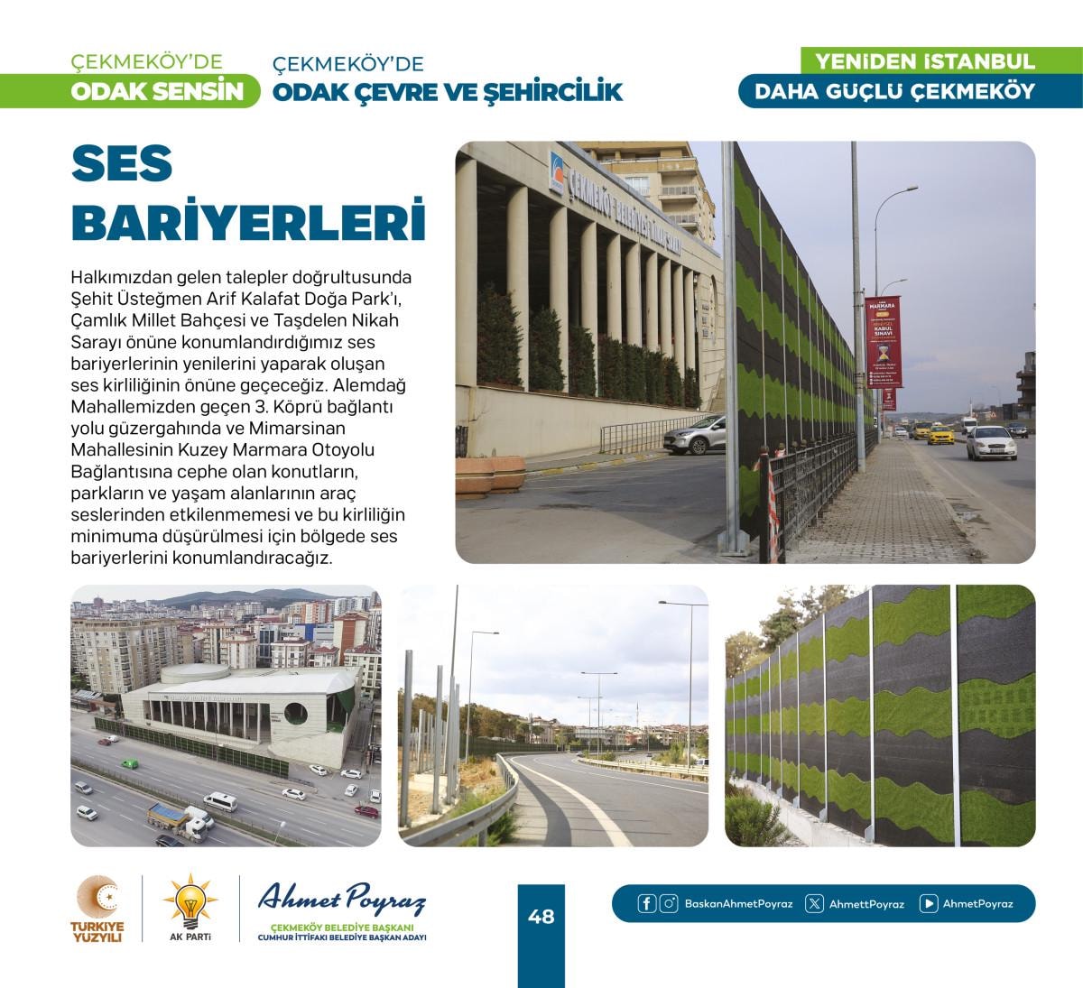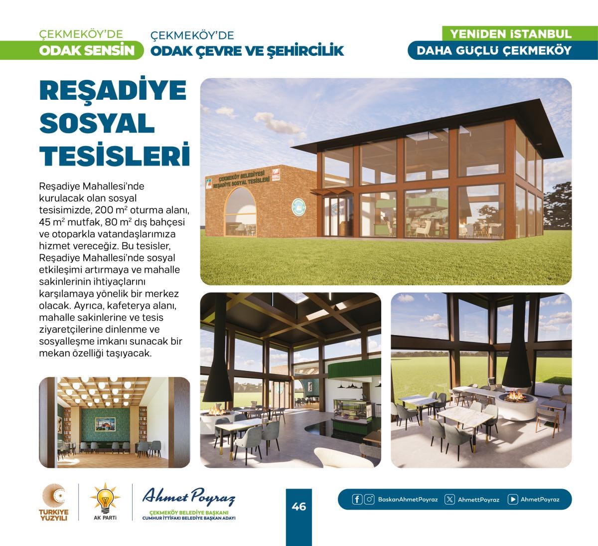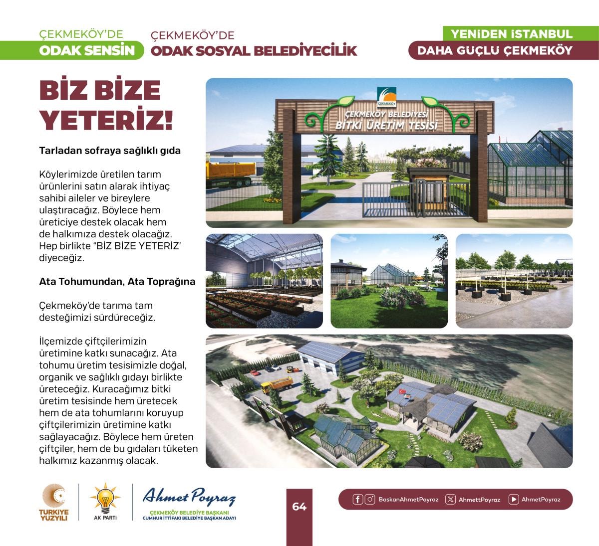 Çıktığımız hizmet yolculuğunda her zaman hemşehrilerimizle iç içe olduk ve bu birliktelik ilçemizdeki çalışmalarımıza pozitif yansıdı. Sizlerden aldığımız geri dönüşlerle şehrimizi birlikte şekillendirme imkanı bulduk. Bu projelerde, tıpkı geride bıraktığımız 15 yılda olduğu gibi sizlerin desteği ve katılımıyla hayat bulacak. Çünkü biz inanıyoruz ki, birlikte çalıştığımızda, birlikte ürettiğimizde Çekmeköy'ümüz daha da güçlenecek ve gelişecek. Siz değerli hemşehrilerimizin görüş ve önerileri, bu yolculukta bize rehberlik edecek. Unutma, Çekmeköy'de odak sensin; çünkü bu şehir, bu güzel ilçe hepimizin. Saygı ve sevgilerimle, “dedi.